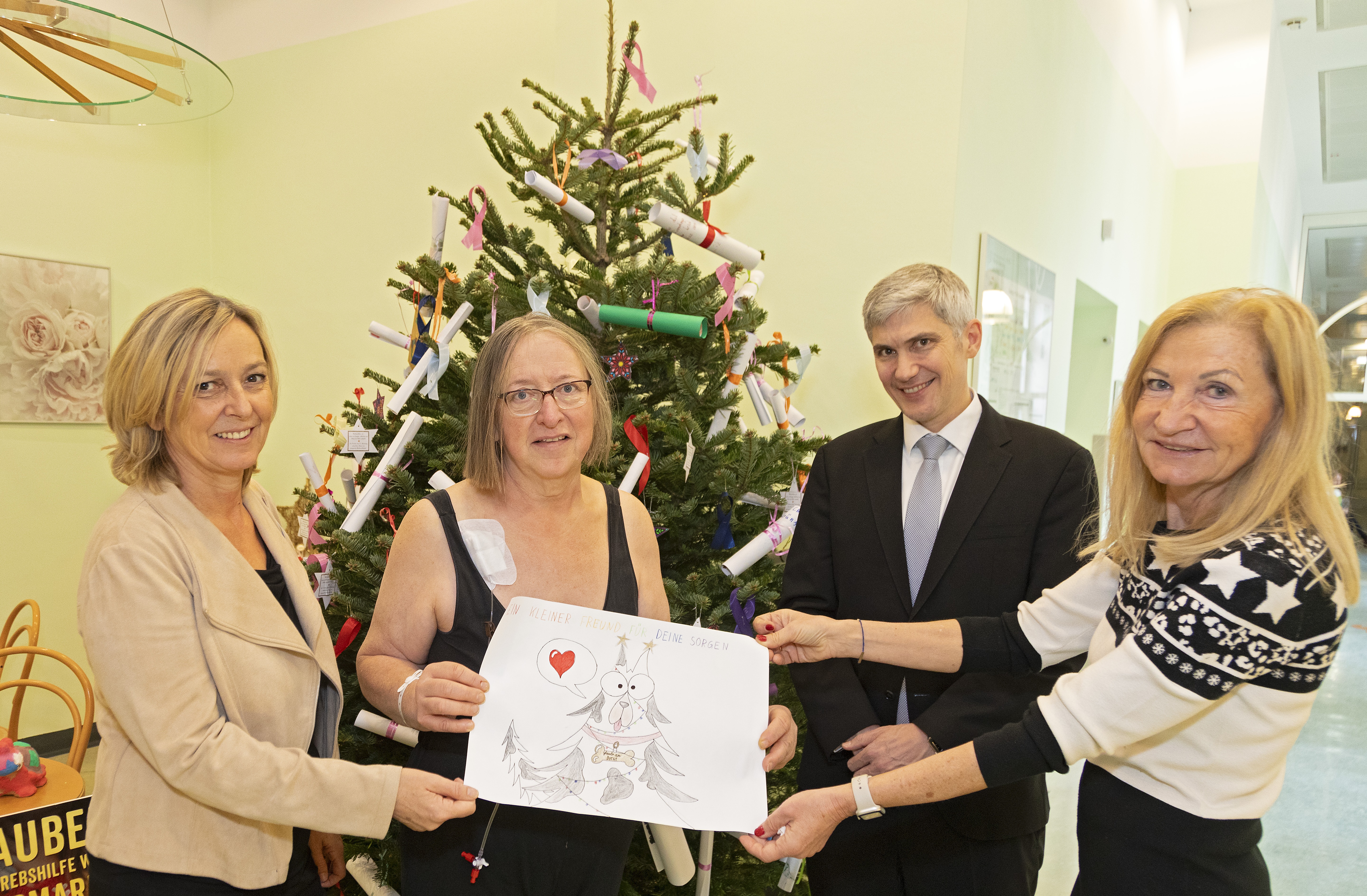 Im Rahmen einer Kooperation zwischen Krebshilfe Wien, Klinik Hietzing und Wiener Volksschulen wurde Krebspatient:innen ein Christbaum mit 200 Herzenswünschen von Kindern geschenkt.
