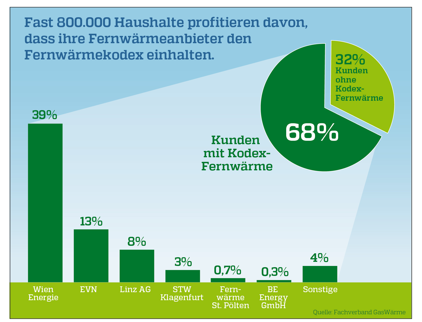 In Summe haben sich bisher 23 Unternehmen mit österreichweit rund 794.200 fernwärmeversorgten Haushalten der Branchenvereinbarung der Fernwärmebranche unterworfen. Das sind nun schon mehr als zwei Drittel des Fernwärmemarkts.