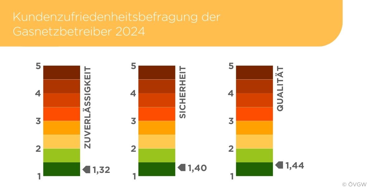 Auch im Jahr 2024 bleiben die österreichischen Gaskunden äußerst zufrieden mit den Leistungen ihrer Gasnetzbetreiber. In einer Befragung durch das Marktforschungsunternehmen marketmind in Bezug auf die drei Dimensionen Zuverlässigkeit, Sicherheit und Qualität der erbrachten Netzdienstleistung haben die Kunden die Gasversorgung in allen Bereichen mit „sehr gut“ bewertet. Im Vergleich zum Vorjahr haben sich die Ergebnisse sogar leicht verbessert.