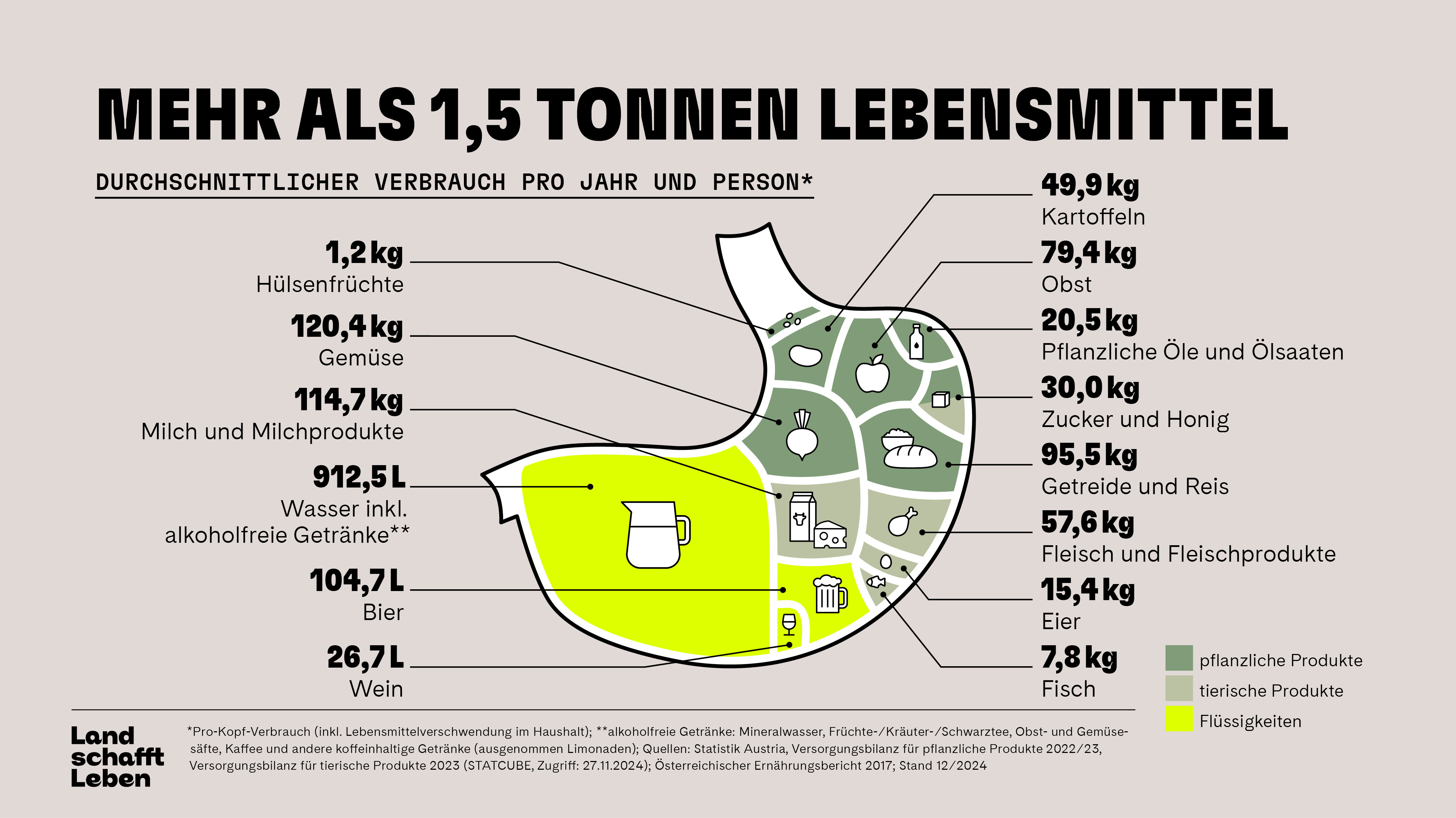 Wenn von eineinhalb Tonnen Lebensmitteln gesprochen wird, stellt diese Zahl einen Durchschnittswert dar. Dabei ist auch jener Teil miteinberechnet, der im Küchenabfall landet. Und so teilt sich diese Menge auf die verschiedenen Lebensmittelgruppen auf - Abweichungen sind je nach Person möglich: Alkoholfreie Getränke stehen mit 913 Litern pro Jahr an der Spitze unseres Getränkekonsums. Dazu zählen Wasser, Mineralwasser, Obst- und Gemüsesäfte, Tee, Kaffee sowie andere koffeinhaltige Getränke. Beim Bier liegt der durchschnittliche Konsum bei über 105 Litern pro Jahr, während Wein auf 27 Liter pro Kopf kommt.