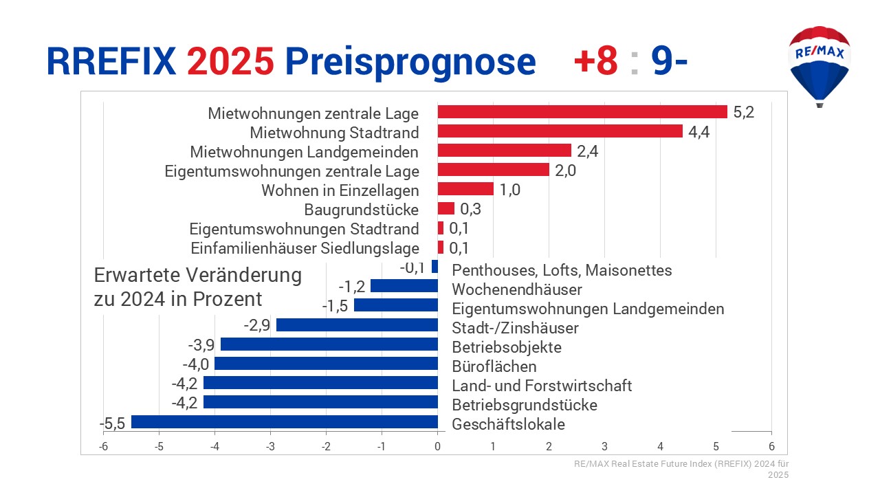 Für 2025 rechnen die österreichweit über 600 RE/MAX-Experten laut dem RE/MAX Real Estate Future Index (RREFIX) nicht wie 2024 mit einem langsameren Rückgang als 2023, sondern bei einigen Immobilientypen mit einem echten positiven Aufwärtstrend. Insgesamt soll die Nachfrage um +5,2 % steigen und das Angebot um +5,4 %. Die Preise sollen im Durchschnitt über alle Kategorien mit +0,3 % nahezu unverändert bleiben. „Das heißt im Klartext: Angebot, Nachfrage und Preis, alle drei Parameter deuten auf Wachstum. Der Immobilienmarkt kommt spürbar in Schwung, ohne dass die Preise gleich wieder explodieren“