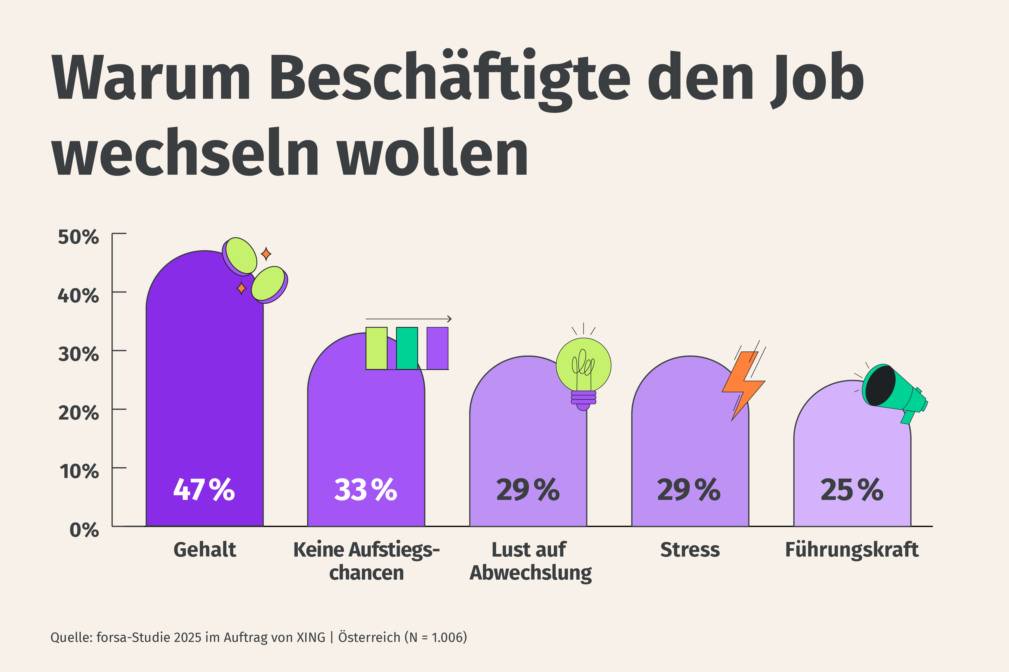 Vor dem Hintergrund wirtschaftlichen Abschwungs und Inflation wünschen sich die Beschäftigten in Österreich ein höheres Gehalt (70 %) und einen langfristig sicheren Job (62 %). Das wirkt sich jedoch nicht auf ihre Wechselwilligkeit aus: 44 Prozent planen dieses Jahr einen Jobwechsel oder sind zumindest offen dafür (2024: 43 %). Damit bleibt die Wechselbereitschaft in den vergangenen 6 Jahren - bis auf einen Ausreißer in 2023 mit 52 % - grundsätzlich stabil. Hauptgründe für den Wechselwunsch sind niedriges Gehalt, mangelnde Aufstiegsmöglichkeiten, ein hohes Stresslevel, sowie eine generelle Lust auf Abwechslung. Das ist das Ergebnis der 2025 XING Studie zur Wechselwilligkeit, durchgeführt von forsa.