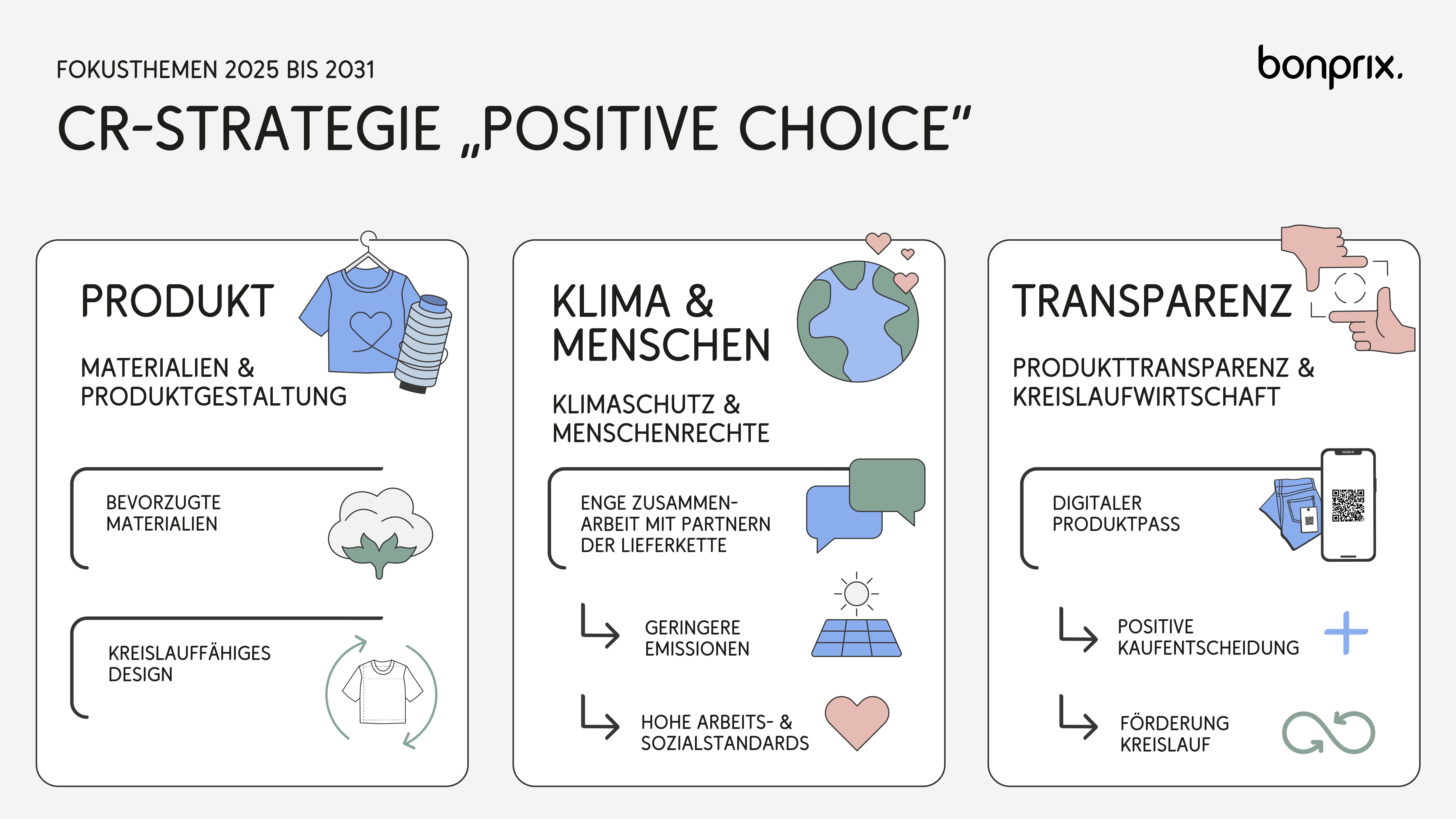 Mit der aktualisierten CR-Strategie "positive choice", die im Einklang mit den strategischen Zielen der Otto Group steht, unterstreicht bonprix sein Engagement für eine nachhaltigere Modeindustrie. Die neuen und weiterentwickelten Ziele in den Bereichen Transparenz, Materialien und Klimaschutz setzen den Rahmen für konkrete Veränderungen. Durch die konsequente Umsetzung der Strategie übernimmt bonprix auch in Zukunft Verantwortung für Produkte, Umwelt und die Menschen in der Lieferkette und stärkt weiter die Zusammenarbeit mit seinen Partner*innen.