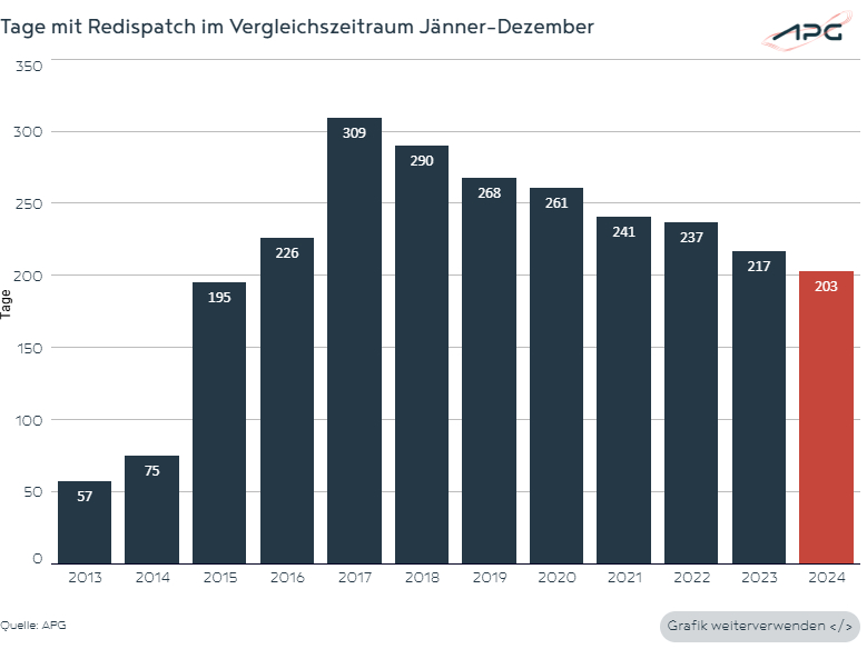 Im gesamten Jahr 2024 musste an 203 Tagen bzw. im Dezember 2024 an 17 Tagen in die Einsatzplanung der Kraftwerke in Österreich eingegriffen werden, um die sichere Stromversorgung zu gewährleisten. Um neun Tage mehr als noch im Dezember 2023. Dabei entstehen Kosten, die der Stromkunde zahlen muss. Bis Ende Dezember 2024 lagen diese Kosten gesamt bei rund 86,5 Millionen Euro.