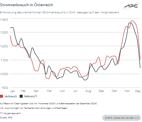 Im Dezember (KW 49-52) wurde in Österreich auf Basis der aktuell vorliegenden Daten 5.174 GWh Strom aus dem öffentlichen Netz verbraucht - um rund 4,5 Prozent mehr als im Dezember 2023 (4.952 GWh). Dies ist der Strombezug aus dem öffentlichen Netz in der Regelzone APG. Damit ist in dieser Zahl der Verbrauch, der durch eigenproduzierten PV-Strom gedeckt wird, nicht enthalten.