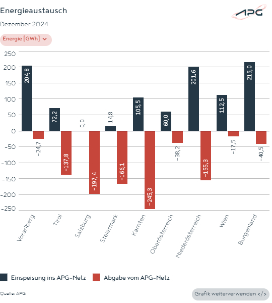 Im Burgenland (215 GWh) und in Vorarlberg (205 GWh) wurden im Dezember die höchsten Energiemengen in das APG-Netz eingespeist und damit österreichweit zur Verfügung gestellt. Von Kärnten (245 GWh) und Salzburg (197 GWh) wurde der meiste Strom aus dem APG-Netz bezogen.