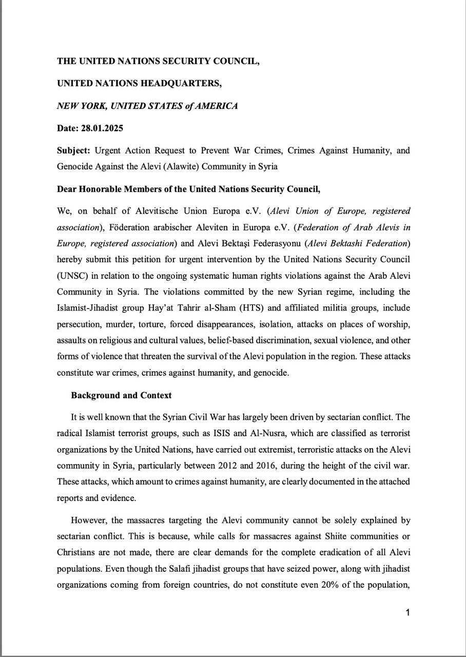 Die arabischen Alawiten und mehrere NGO haben sich an die UNO New York mit Fakten, Beweisen und Quellen mit mehreren Anwälten, Richter, Staatsanwälte und Beweise mit dem Titel, „Appell der syrischen alawitischen NGO in Europa. Die Angriffe stellen Kriegsverbrechen, Verbrechen gegen die Menschlichkeit und Völkermord dar“ zeigt leider auf, dass ihre in Wien ansässigen Mitglieder und Bekannten der Türkischen Kulturgemeinde in Österreich die Massaker an der syrisch-arabischen Minderheit der Alawiten seit der HTS Golani-Regierung registriert haben und täglich mit steigender Tendenz fortsetzen.