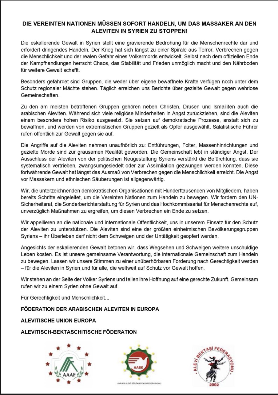 Arabische, türkische und kurdische alevitische Nichtregierungsorganisationen (NRO) in Europa rufen dringend dazu auf, die anhaltende und unter verschiedenen Vorwänden eskalierende Gewalt gegen die alevitische Gemeinschaft in Syrien, die von Mord, Folter, sexueller Gewalt, Verschwindenlassen und massiver Vertreibung gekennzeichnet ist, als schwere humanitäre Krise einzustufen, die ein sofortiges und entschiedenes Handeln der Vereinten Nationen erfordert. Der systematische Charakter dieser Gräueltaten, die von staatlichen und nichtstaatlichen Akteuren in der offensichtlichen Absicht begangen werden, eine religiöse und ethnische Minderheit ins Visier zu nehmen, stellt eine eklatante Verletzung des Völkerrechts dar, einschließlich der Genfer Konventionen, der Allgemeinen Erklärung der Menschenrechte und des Übereinkommens über die Verhütung und Bestrafung des Völkermordes.