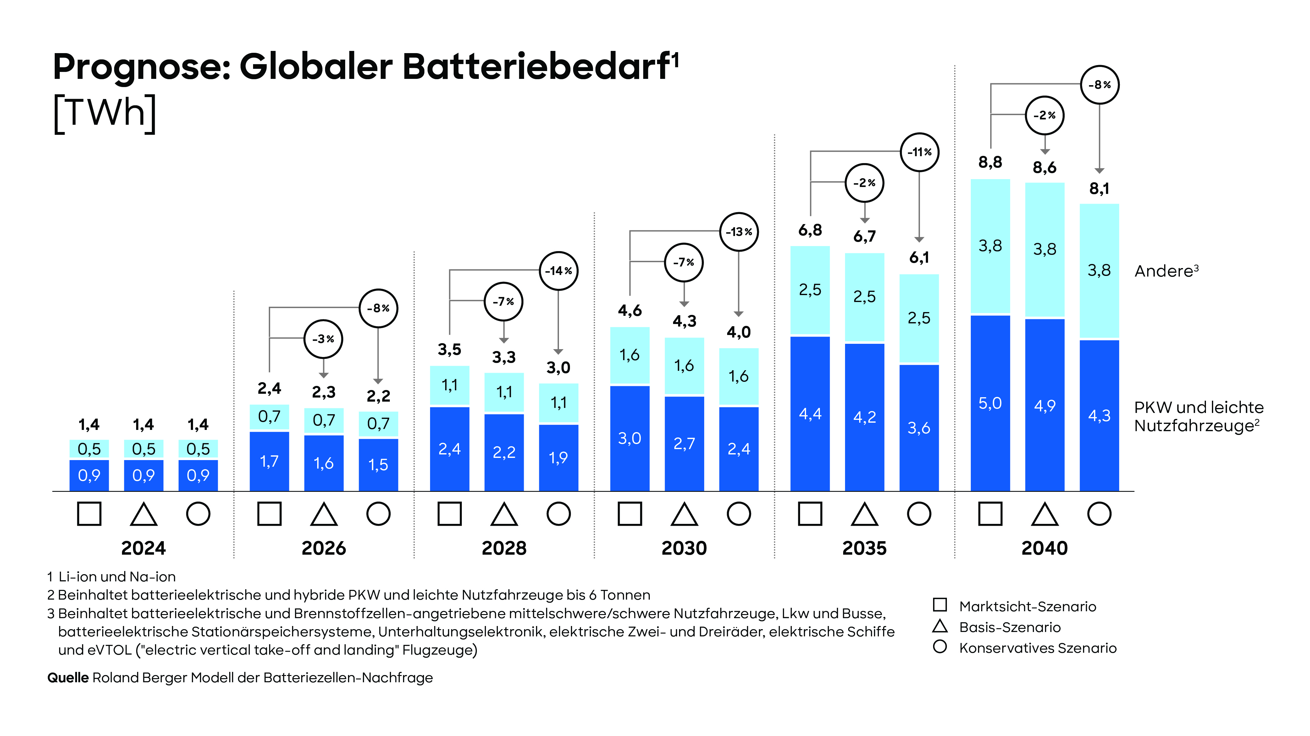 - Battery Monitor 2024/2025 von Roland Berger und RWTH Aachen: Bedarf verdreifacht sich bis 2030 auf bis zu 4,6 Terawattstunden; weitere Verdoppelung bis 2040