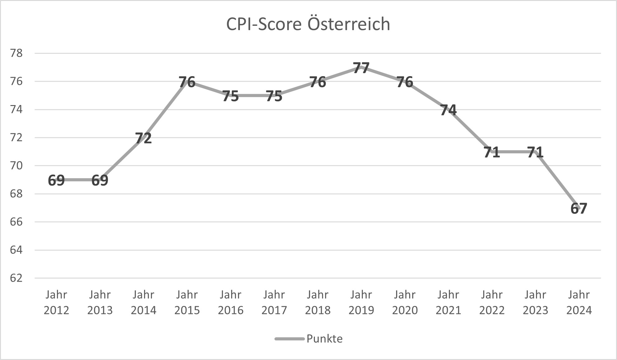 Wien, 11.02.2025: Der heute veröffentlichte Korruptionswahrnehmungsindex 2024 (Corruption Perception Index „CPI“ 2024) von Transparency International (TI) zeichnet ein alarmierendes Bild von Österreich. Das aktuelle Ergebnis ist mit nur 67 Punkten und Rang 25 das schlechteste seit Beginn der Veröffentlichung des CPI. Im Vergleich zu anderen europäischen Ländern ist Österreich weit abgeschlagen und der Negativtrend ist schockierend: Im Vorjahr lag Österreich auf Platz 20, vor drei Jahren sogar noch auf Platz 13.