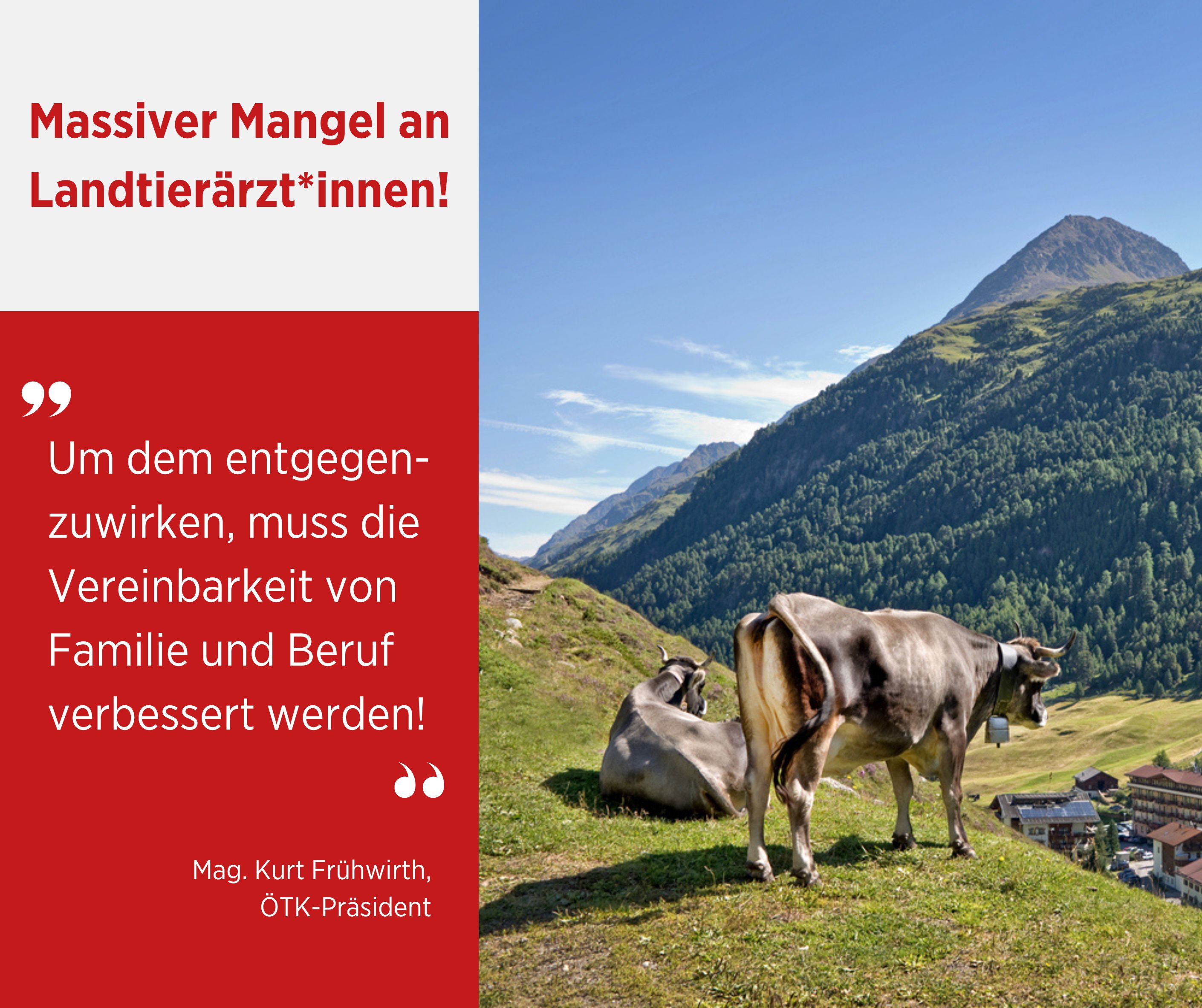 „Jeden Monat erreichen uns alarmierende Hilferufe aus verschiedenen Regionen Österreichs. Besonders in der Nutztiermedizin droht ein massiver Versorgungsengpass“, betont Mag. Kurt Frühwirth, Präsident der Österreichischen Tierärztekammer und warnt: „Ohne sofortige Maßnahmen riskieren wir einen Kollaps der tierärztlichen Versorgung in einigen ländlichen Regionen. Es muss dringend gehandelt werden! Eine klare Strategie, von der Studienaufnahme bis zum Berufseinstieg, ist längst überfällig.“