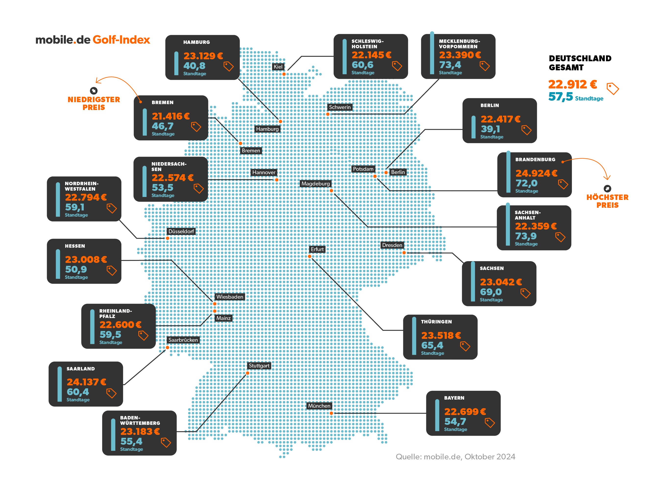 - Im Osten teuer: Mit 24.924 Euro ist der Golf-Preis in Brandenburg am höchsten und liegt 11,8 Prozent über dem Bundesdurchschnitt.