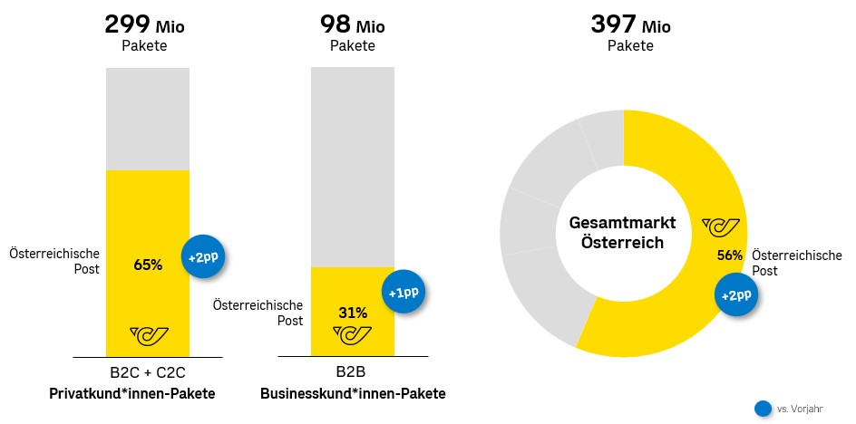 „Zwei von drei Privatkund*innen-Paketen werden in Österreich von der Post zugestellt, darauf sind wir stolz! Auch bei den Businesskund*innen-Paketen konnten wir zulegen und haben dadurch nun einen Anteil von 56 Prozent am heimischen Gesamtmarkt. Das bestätigt uns auf unserem Weg, sowohl in Qualität als auch in Kapazität zu investieren.