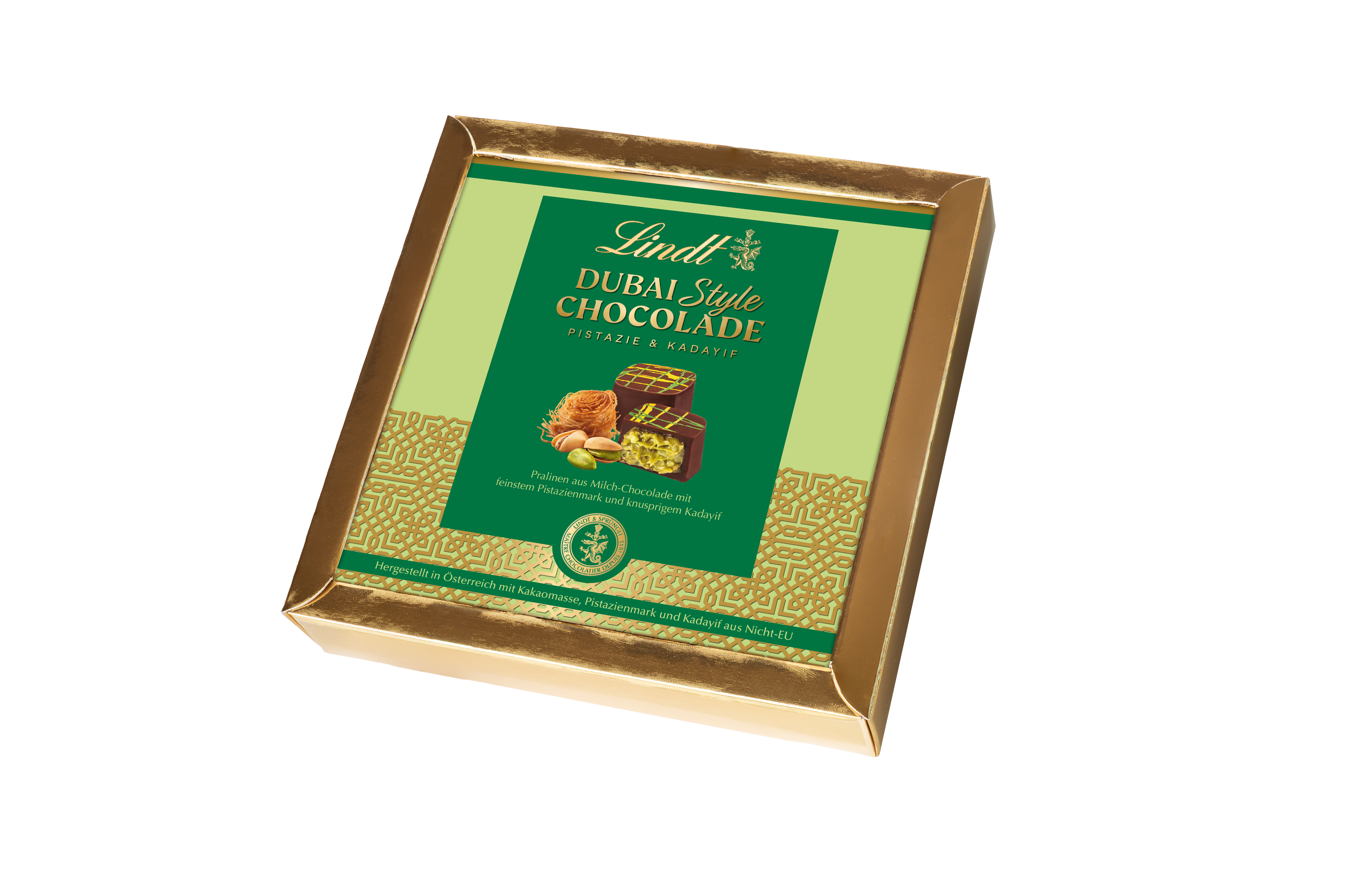 Lindt Dubai Style Chocolade Pralinen: Hergestellt in Österreich, mit Kakaomasse, Pistazienmark und Kadayif aus Nicht-EU