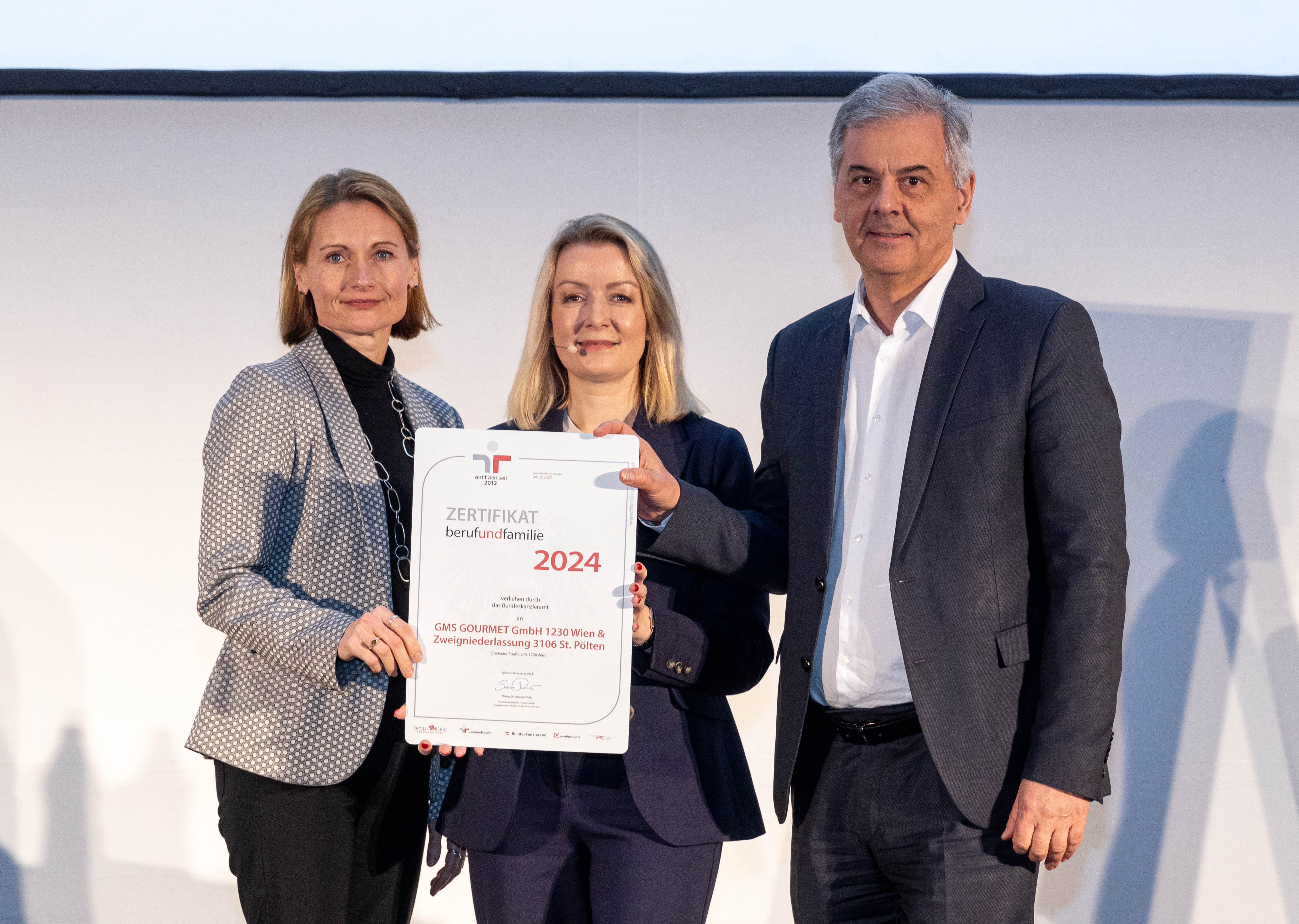 Das Gütezeichen wurde von Bernadett Humer, Sektionsleiterin Familie und Jugend im Bundeskanzleramt an Geschäftsführer Johann Pinterits sowie Renate Berg-Zelko, Frauen- und Familienbeauftragte bei GOURMET, übergeben.