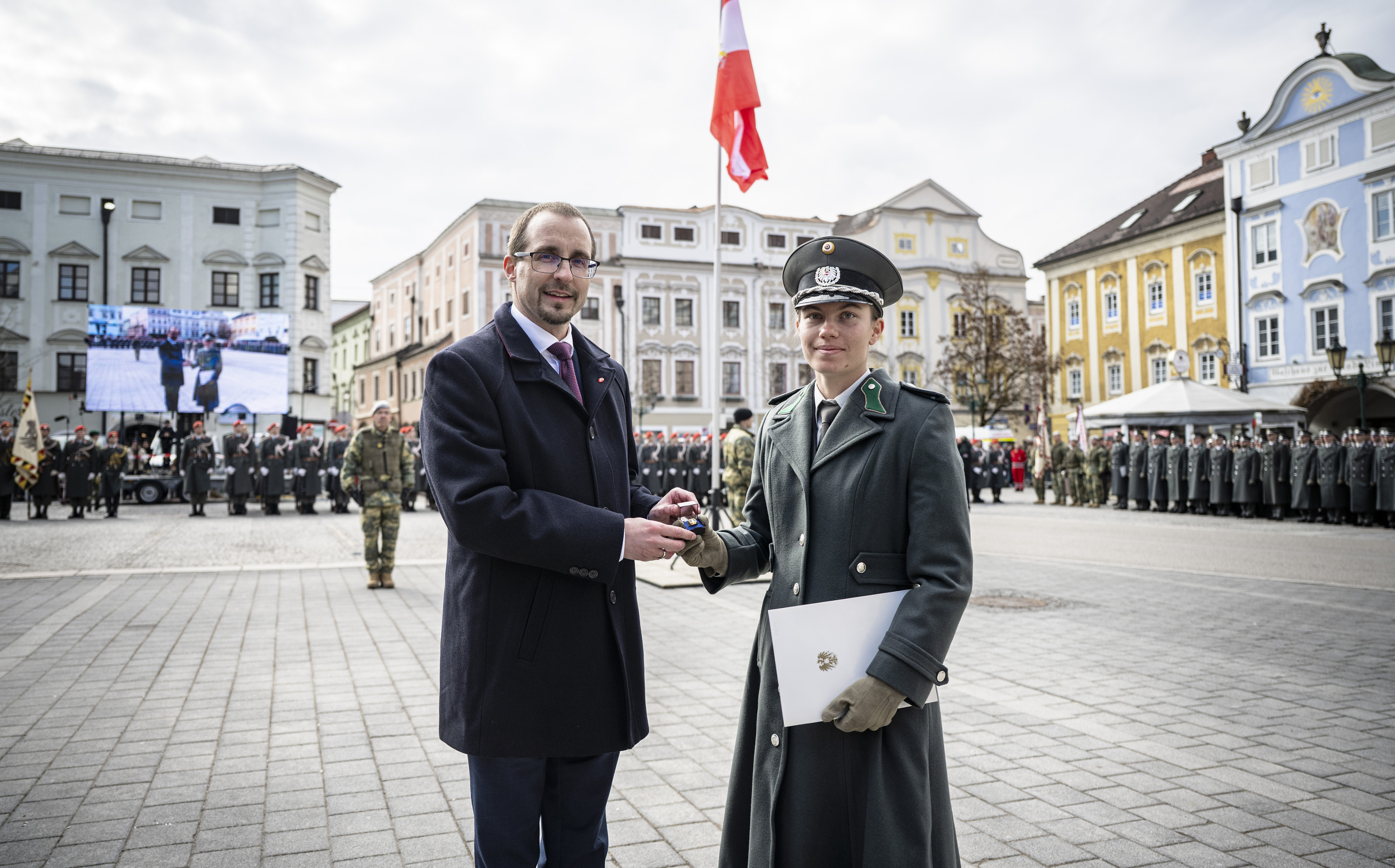Am Hauptplatz von Enns wurden sechs Absolventen - vier Lehrgangssprecher, die Frauenbeauftragte und ein Vertreter der Miliz - stellvertretend für alle Absolventen zum Wachtmeister befördert.