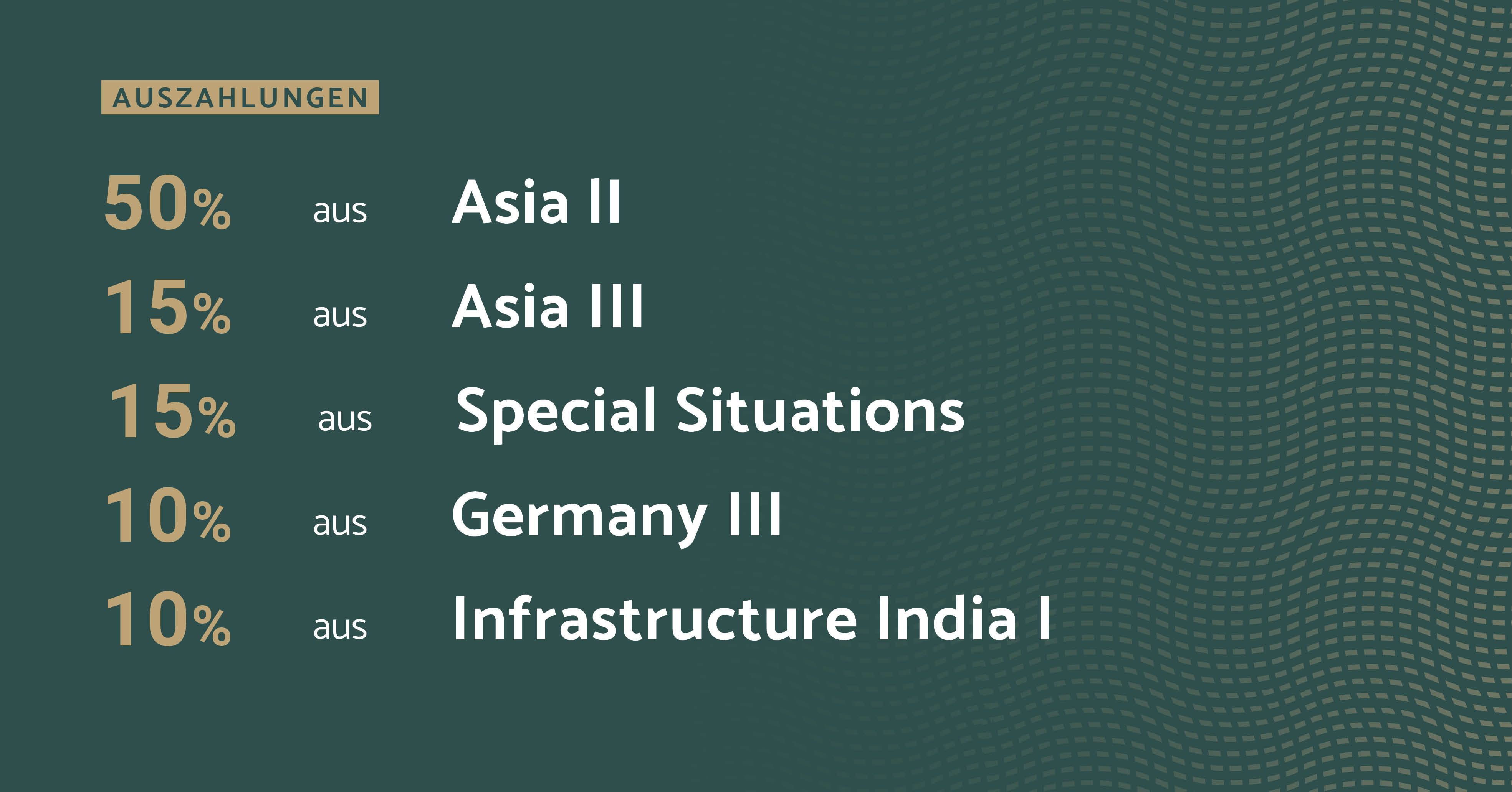 Der Dachfonds Asia II hat seine erste Auszahlung im Jahr 2024 vorgenommen. Bereits jetzt erreicht er mit einer großen Auszahlung in Höhe von 50 Prozent eine Quote von insgesamt 70 Prozent. Mit der achten Auszahlung hat der Dachfonds Germany III währenddessen die 100-Prozent-Marke überschritten.