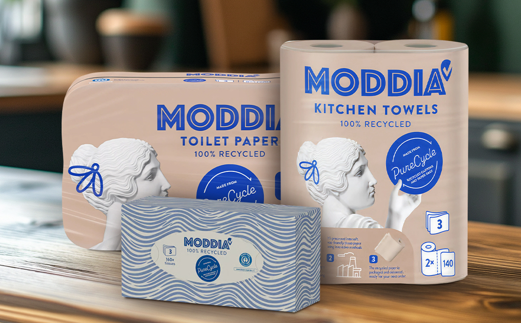 Die MODDIA PureCycle-Linie umfasst Toilettenpapier, Küchenrollen und Kosmetiktücher. Das Toilettenpapier und die Küchenrollen bestehen aus den Fasern alter Pappkartons und Papiertragetaschen. Auch ihre Verpackungen sind möglichst ressourcenschonend produziert und bestehen aus 60 % recyceltem Plastik. Die Taschentücher kommen in Kartonboxen aus 100 % recyceltem Material.