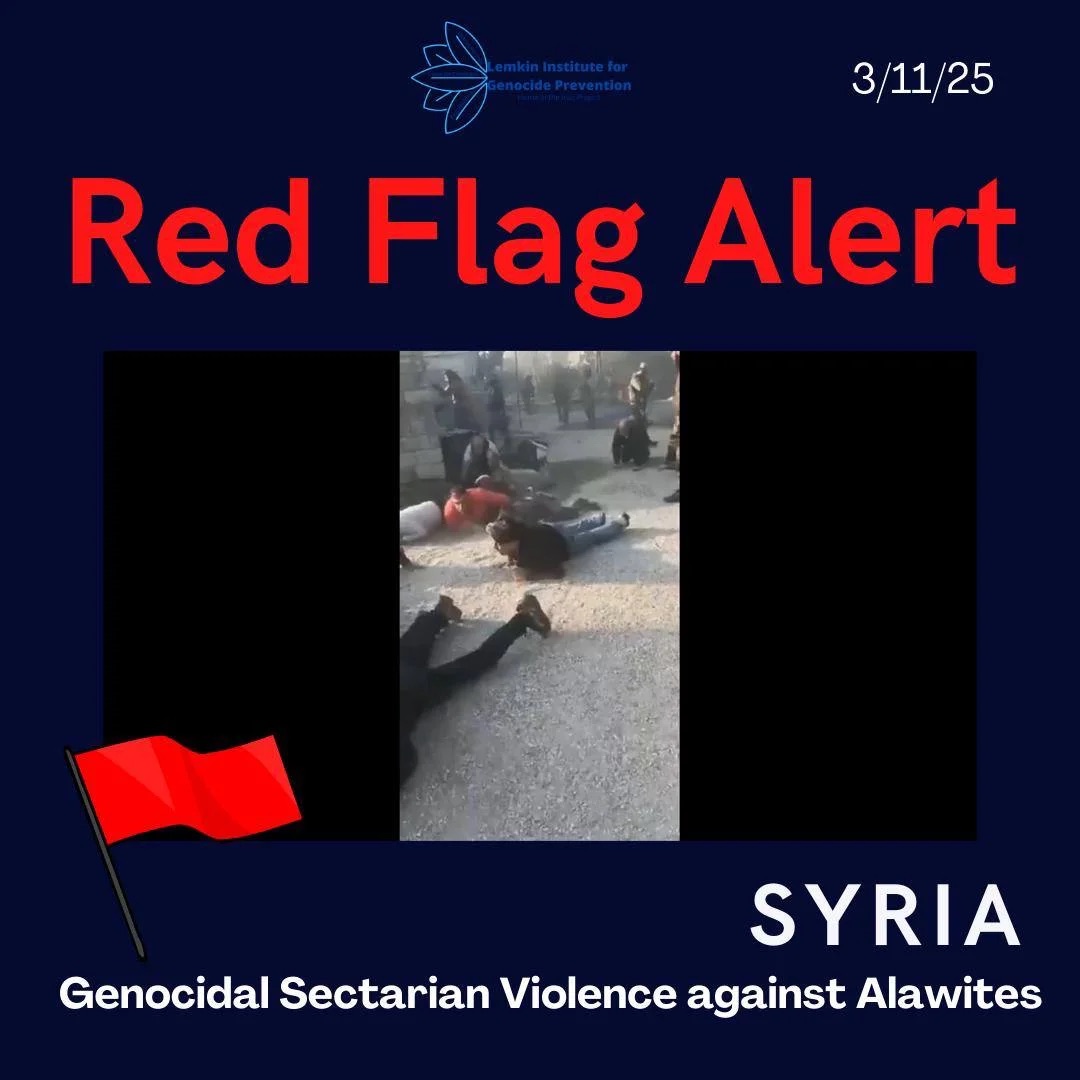 „Das Institut gibt eine dringende Rote-Flagge-Warnung für Syrien heraus, da die kritische Gefahr eines Völkermords an Syrern der alawitischen Sekte in der Küstenregion Syriens besteht. Seitdem sind zahlreiche Videos und Berichte über die Hinrichtung Dutzender unbewaffneter Zivilisten, darunter Frauen, Kinder, ältere Menschen und Säuglinge, durch Kämpfer der neu gegründeten Allgemeinen Sicherheitsbehörde der syrischen Übergangsregierung und bewaffneter Gruppen, die mit der offiziell aufgelösten militanten Gruppe Hay'at Tahrir al-Sham (HTS) und der Syrischen Nationalarmee (SNA) in Verbindung stehen, aufgetaucht. In diesen Videos werden Männer öffentlich gefoltert, gedemütigt und zum Bellen gezwungen, bevor sie hingerichtet werden. Die dritte Gruppe von Bildern und Videos zeigt Leichen, die auf den Straßen von Vierteln und Städten mit einer großen alawitischen Bevölkerung liegen, darunter Baniyas, al-Mukhtariya, al-Tuwaym, al-Haffah, al-Datour (Latakia) und Jableh. Ein Augenzeuge in Latakia beschrieb Szenen von „Leichen auf den Straßen“ und wie bewaffnete Gruppen 150 Menschen in einem einzigen Viertel getötet hätten. Darüber hinaus verhöhnten HTS-nahe Kanäle in sozialen Medien (z. B. Telegram) die Toten, indem sie die Köpfe von Mitgliedern der alawitischen Gemeinschaft zum Verkauf anboten (die Bilder sind aufgrund eines Verstoßes gegen die Nutzungsbedingungen von Telegram nicht mehr verfügbar). In einem anderen Video feiern die syrischen Streitkräfte die Tötung von mindestens 20 überwiegend männlichen Personen, die in verschiedenen Entkleidungszuständen zu sehen sind. Die meisten Leichen sind mit dem Gesicht nach unten in einem Raum auf der Straße aufgereiht".