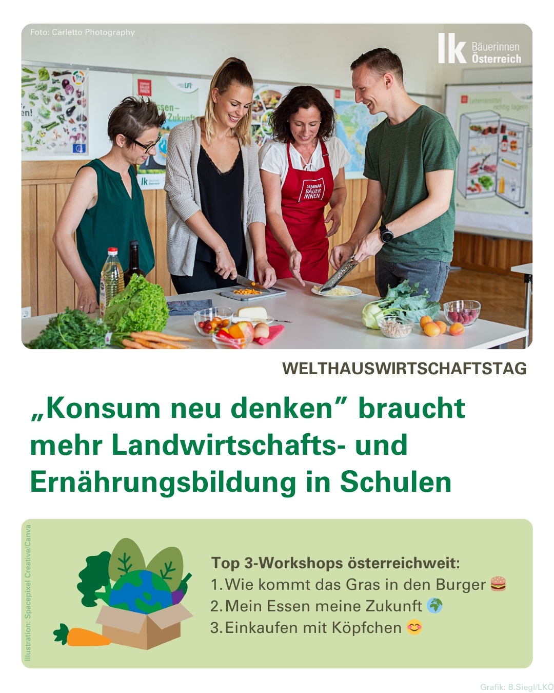 Zahlreiche Studien belegen, die Menschheit lebt über ihre Verhältnisse und vor allem die des Planeten - Nachhaltigkeit und Umweltschutz aber auch Versorgungssicherheit sowie der Kampf gegen Lebensmittelverschwendung und Ressourcenvergeudung sind Kernthemen unserer Zeit. Der diesjährige Welthauswirtschaftstag am 21. März wurde daher unter das Motto "Konsum neu denken" gestellt. Für die Arbeitsgemeinschaft Österreichische Bäuerinnen Anlass, um ihre langjährige Forderung nach einer stärkeren Verankerung von Ernährungs- und Konsumbildung im Schulunterricht für alle 10- bis 14-Jährigen zu bekräftigen. “Nur durch fundiertes Wissen und praxisnahe Erfahrungen können junge Menschen lernen, nachhaltige Konsumentscheidungen zu treffen und damit die Ernährungssicherheit der Zukunft mitzugestalten“, erklärt Bundesbäuerin Irene Neumann-Hartberger.