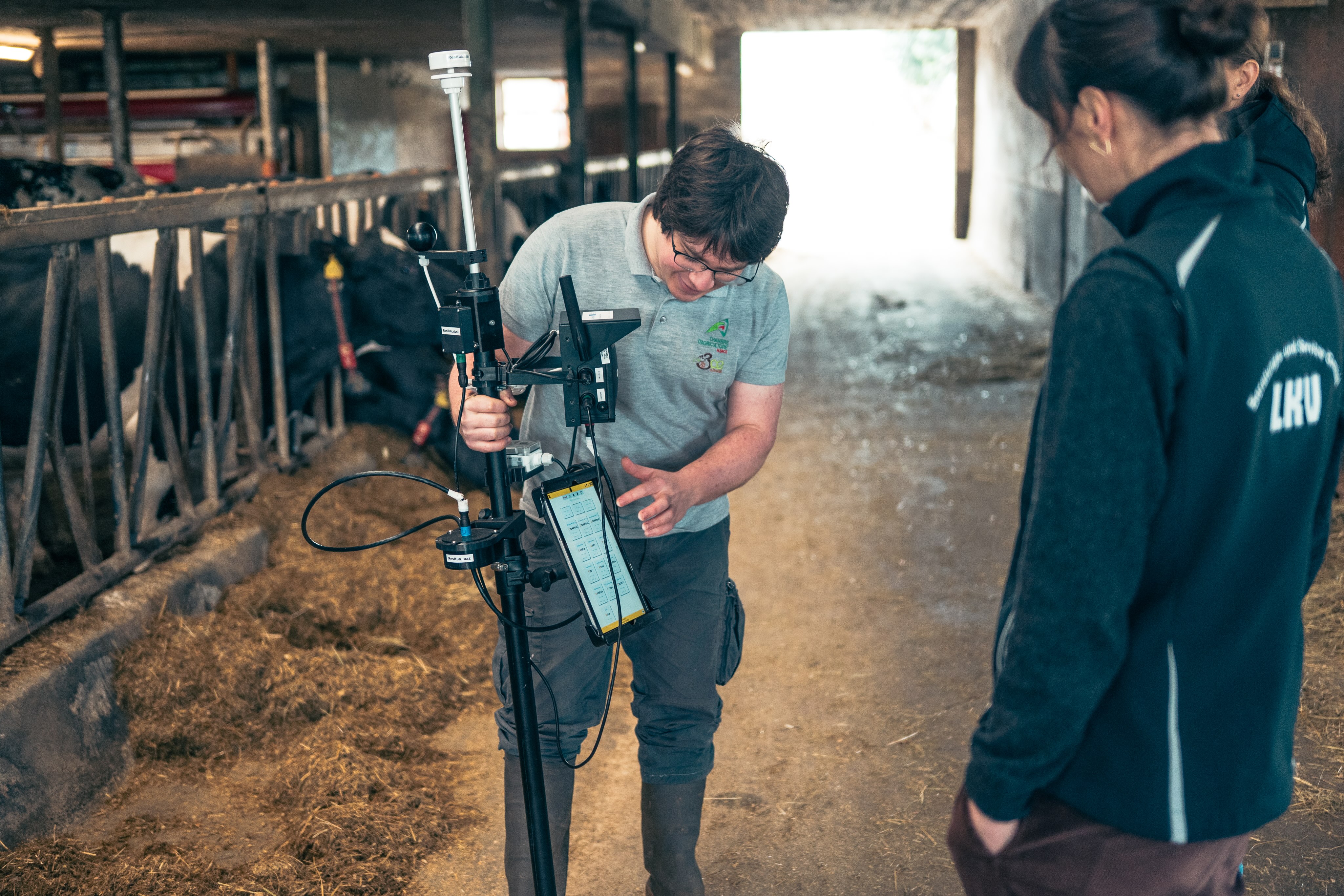 Eine Allianz aus der Landwirtschaftskammer des Elsass, dem Landesverband Baden-Württemberg (LKV BW) und grenzüberschreitenden Partnern arbeitet an Lösungskonzepten, die den Menschen, den Tieren und der Umwelt nachhaltig zugutekommen: Das Projekt ResKuh. Im Fall der Familie Fritsch ist das etwa eine Analyse der klimatischen Bedingungen im Stall. Dabei kommt ein spezielles Diagnosegerät zum Einsatz, welches auch beim zweiten Hinschauen an eine Mischung aus Zauberstab und Antenne erinnert. Alle vier Meter nimmt Clément Eck, Beauftragter Klimawandel bei der Landwirtschaftskammer Elsass und Pilot des ResKuh-Projekts Messungen vor und kann damit eine Klimakarte der Scheune entwerfen. Daraus lässt sich zum Beispiel ableiten, an welcher Stelle Ventilatoren Sinn machen oder andere Maßnahmen für ein besseres Raumklima hilfreich sind.