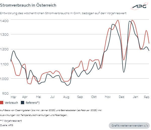 Im Februar (KW 6-9) wurden in Österreich auf Basis der aktuell vorliegenden Daten 4.991 GWh Strom aus dem öffentlichen Netz verbraucht – um rund 4 Prozent mehr als im Vorjahr (4.809 GWh). Dies ist der Strombezug aus dem öffentlichen Netz in der Regelzone APG. Darin ist der Verbrauch, der durch eigenproduzierten PV-Strom gedeckt wird, nicht enthalten.