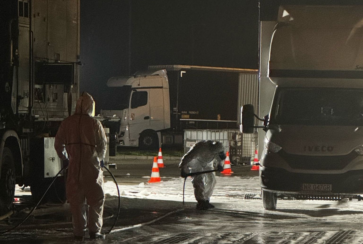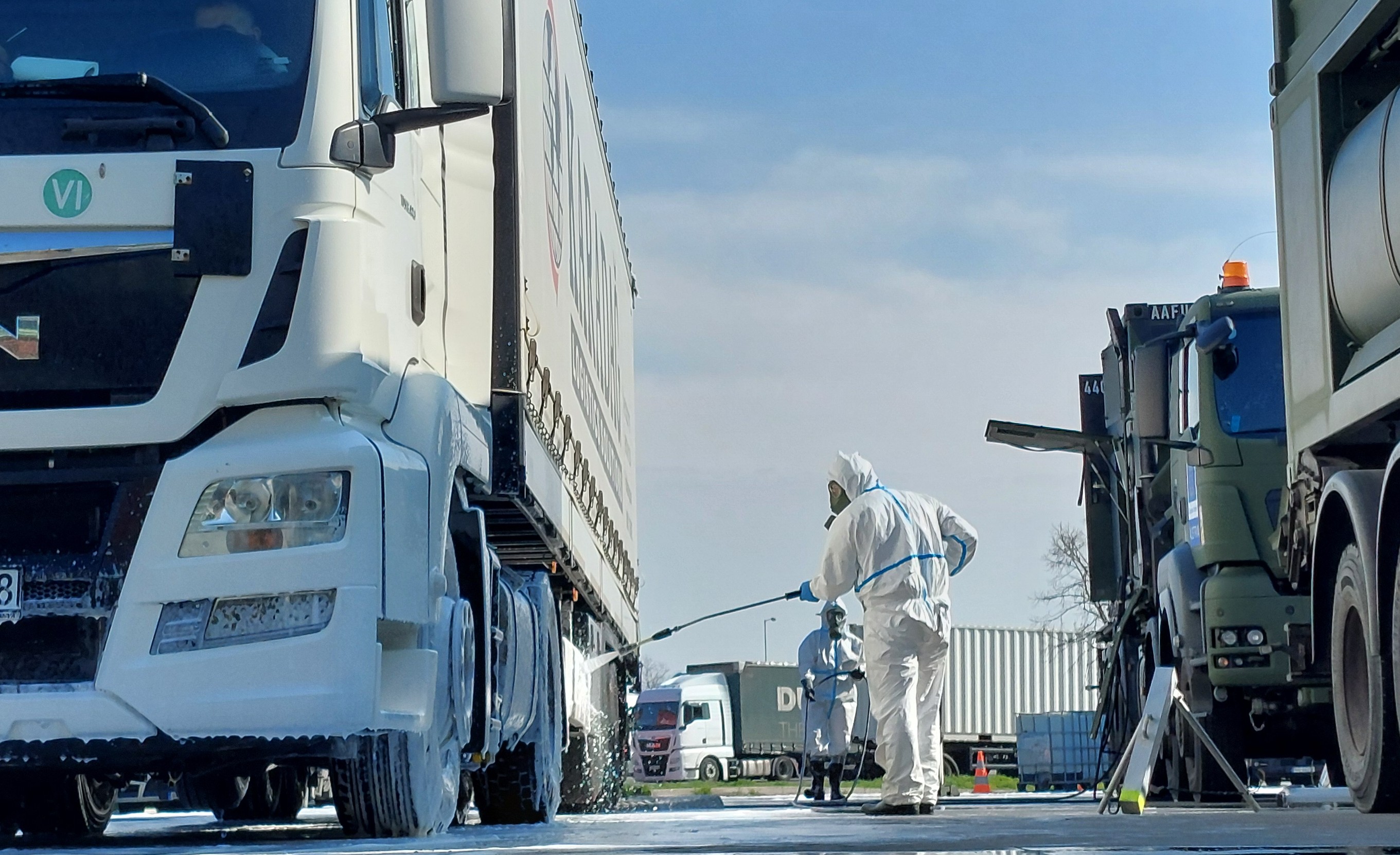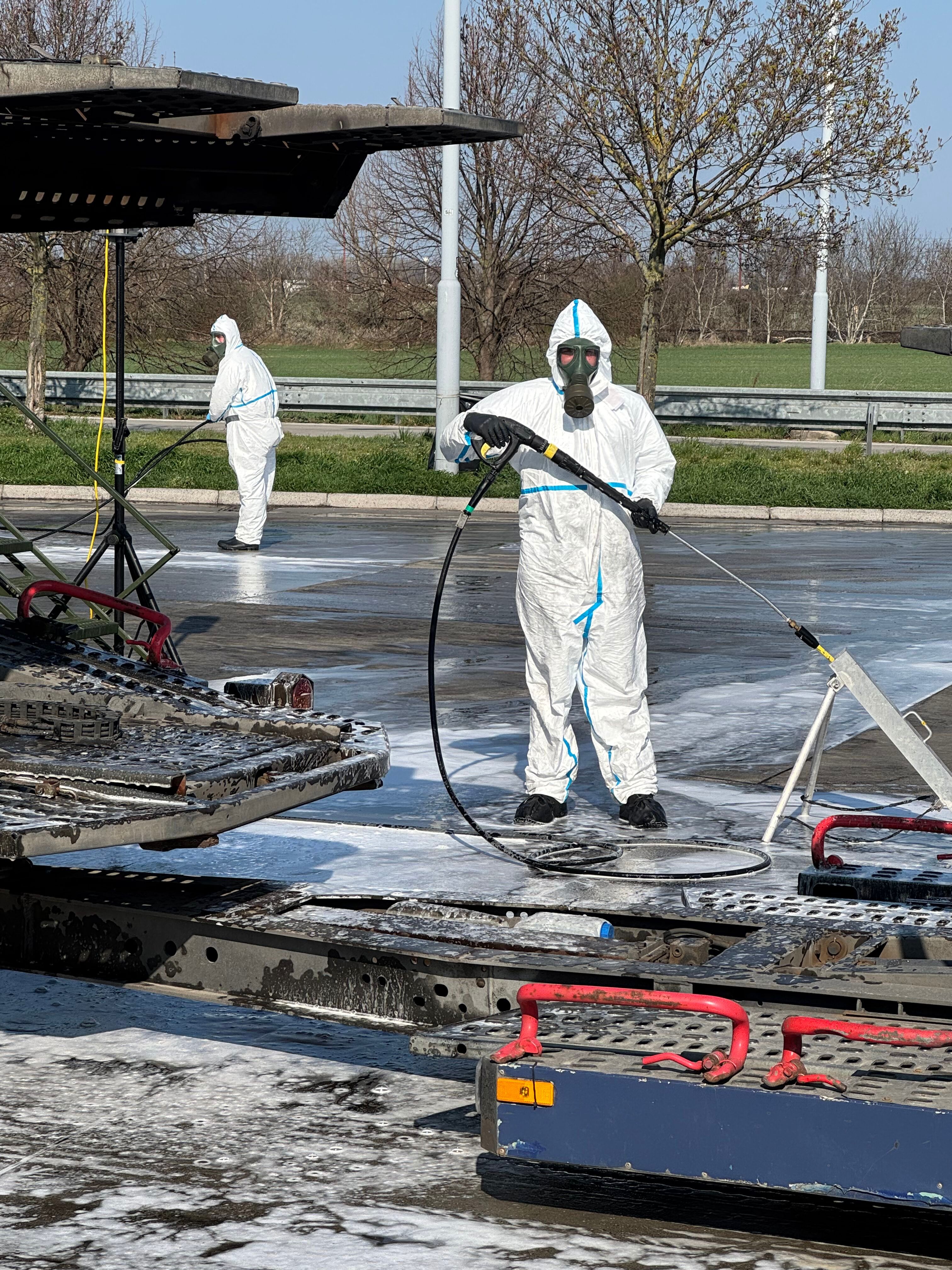 Verlegt hat die AFDRU-Einheit mit 18 Fahrzeugen, davon 6 Spezialfahrzeugen. Durch die Dekontaminationsgruppen können bis zu 25 Großfahrzeuge pro Stunde dekontaminiert werden. Stündlich werden derzeit 1.000 Liter Wasser und 100 Liter Chemikalien zur Desinfektion benötigt. Bis heute Früh wurden bereits mehr als 700 Fahrzeuge dekontaminiert.
