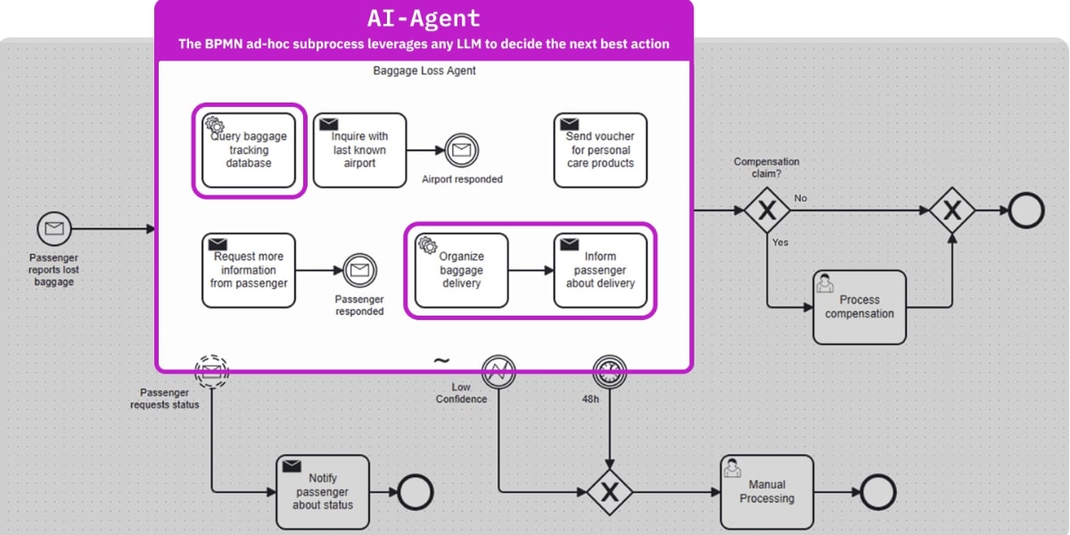 - Ad-hoc Sub-Prozesse - Aufgaben können dynamisch aktiviert werden, ohne die Abfolge im Vorfeld exakt festzulegen. Durch die Nutzung von Ad-hoc Sub-Prozessen in BPMN (Business Process Model and Notation) können KI-Agenten innerhalb eines definierten Rahmens Aufgaben eigenständig verwalten, sie in beliebiger Reihenfolge ausführen, und Schritte situationsabhängig wiederholen oder überspringen. Dank der nativen Unterstützung von Ad-hoc Sub-Prozessen und KI-Konnektoren bietet Camunda die Möglichkeit, KI mit reduziertem Risiko in Prozesse zu integrieren und zu testen.