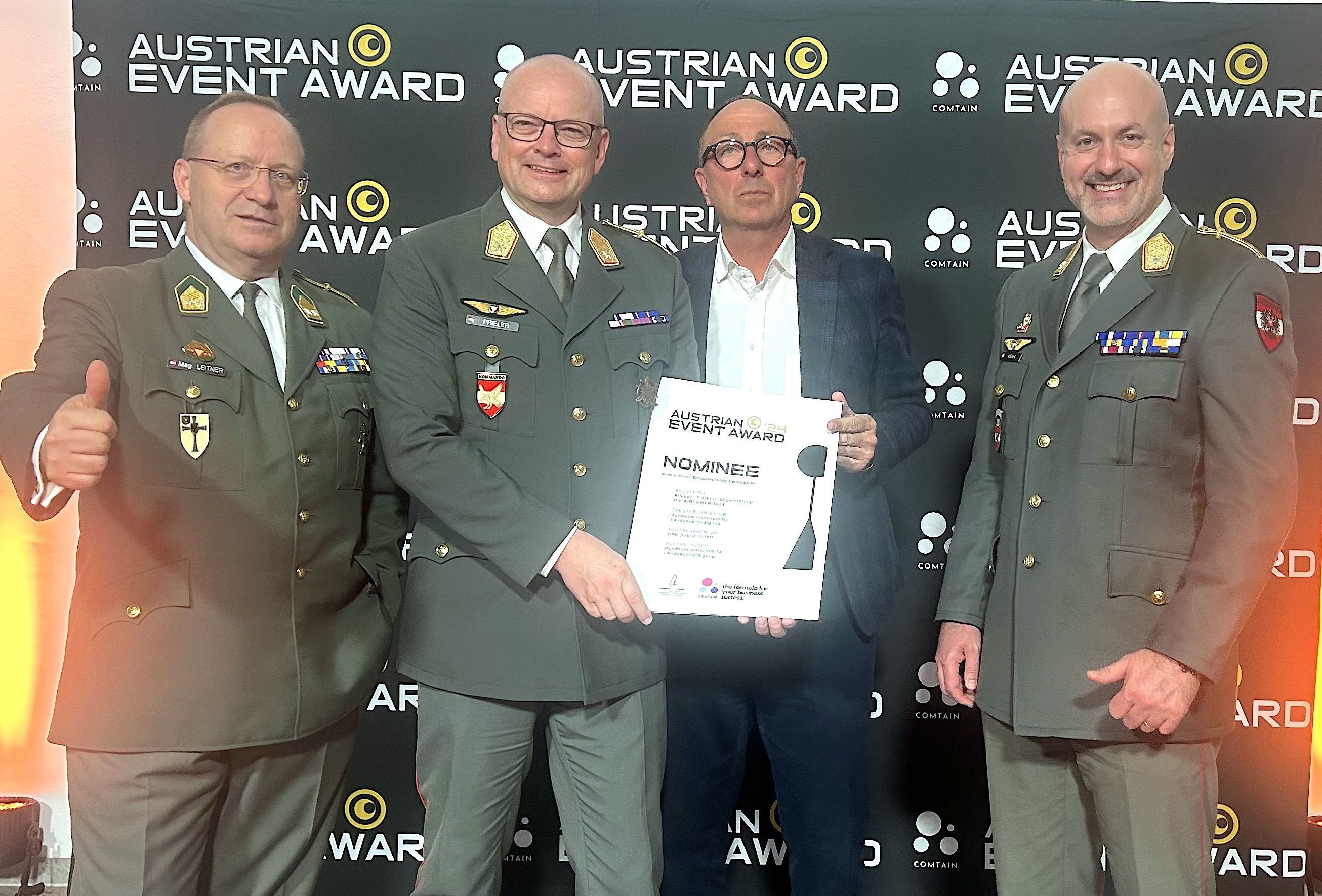 Seit 1996 werden jährlich beim Austrian Event Award die besten österreichischen Events und deren Auftraggeber vor den Vorhang geholt. Gestern, Dienstagabend, fand die große Austrian Event Award-Gala vor über 400 Gästen der Kommunikationsbranche im Airport Convention Center am Flughafen Schwechat statt, um die besten Events des Jahres 2024 auszuzeichnen. Dabei wurde die AIRPOWER24 mit dem Motto "Fliegen. Freiheit. Begeisterung." als einer der fünf besten „Public Corporate Events“ des Vorjahres mit einer „Nominee“-Urkunde ausgezeichnet.