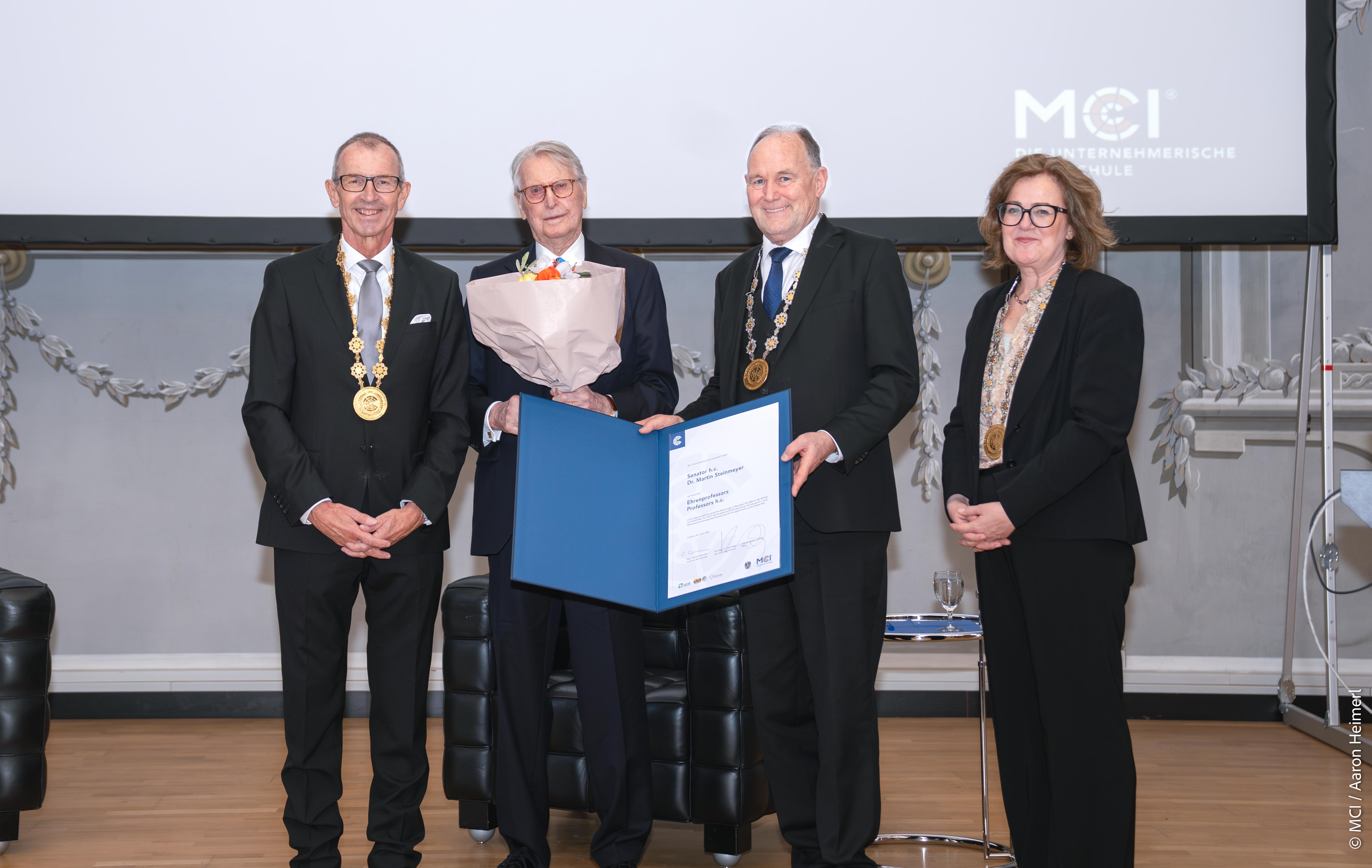 Mit der Ehrenprofessur für Senator h.c. Dr. Martin Steinmeyer ehrt das MCI einen langjährigen engagierten Förderer des Wissenschafts- und Hochschulstandorts Innsbruck. In seiner Laudatio würdigte MCI Rektor Prof. Dr. Andreas Altmann das beeindruckende unternehmerische Wirken sowie umfassende gesellschaftliche, kulturelle und wissenschaftliche Engagement von Martin Steinmeyer, darunter großzügige finanzielle Zuwendungen zugunsten der Studienförderpreise des Deutschen Freundeskreises, des Clemens-August-Andreae-Preises der Innsbrucker Universitäten, der Krebsforschung des Tiroler Krebsforschungsinstituts sowie unternehmerischer Vorhaben junger Menschen am MCI.