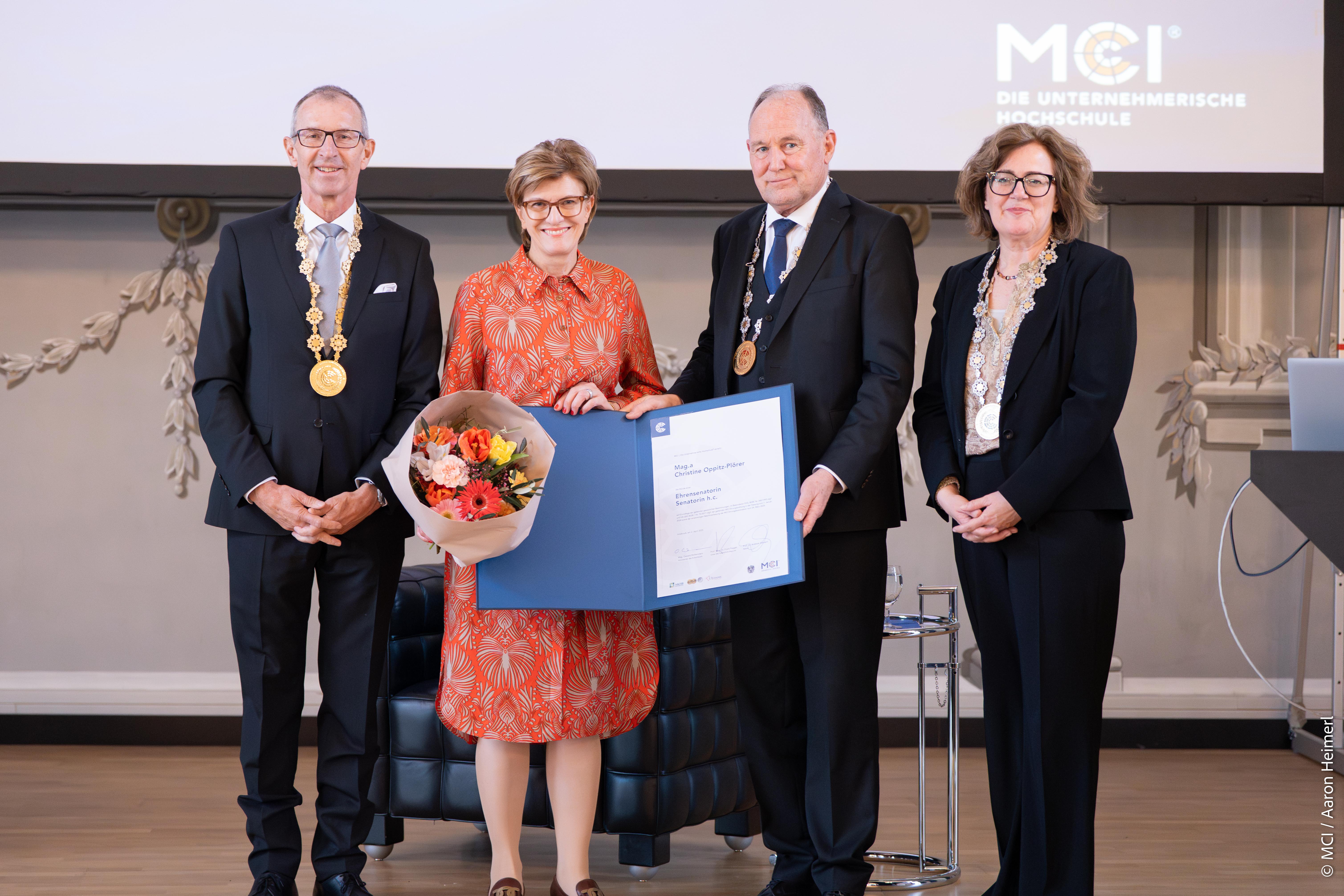 In Würdigung ihrer langjährigen und engagierten Unterstützung hielt der Leiter des MCI Hochschulkollegiums Prof. Dr. Franz Pegger eine launige Laudatio auf die ehemalige Bürgermeisterin der Landeshauptstadt Innsbruck Mag. Christine Oppitz-Plörer: „Vieles, was das MCI heute ausmacht, wäre ohne den Beitrag von Christine Oppitz-Plörer nicht möglich gewesen. Als Mitglied in zahlreichen gesellschaftsrechtlichen Organfunktionen des MCI, als Stadträtin, Vizebürgermeisterin und als Bürgermeisterin unserer Universitäts- und Hochschulstadt war sie stets ein starkes Rückgrat des Wissenschafts- und Bildungsstandorts Innsbruck und kraftvoller Motor für die Entwicklung des MCI.“