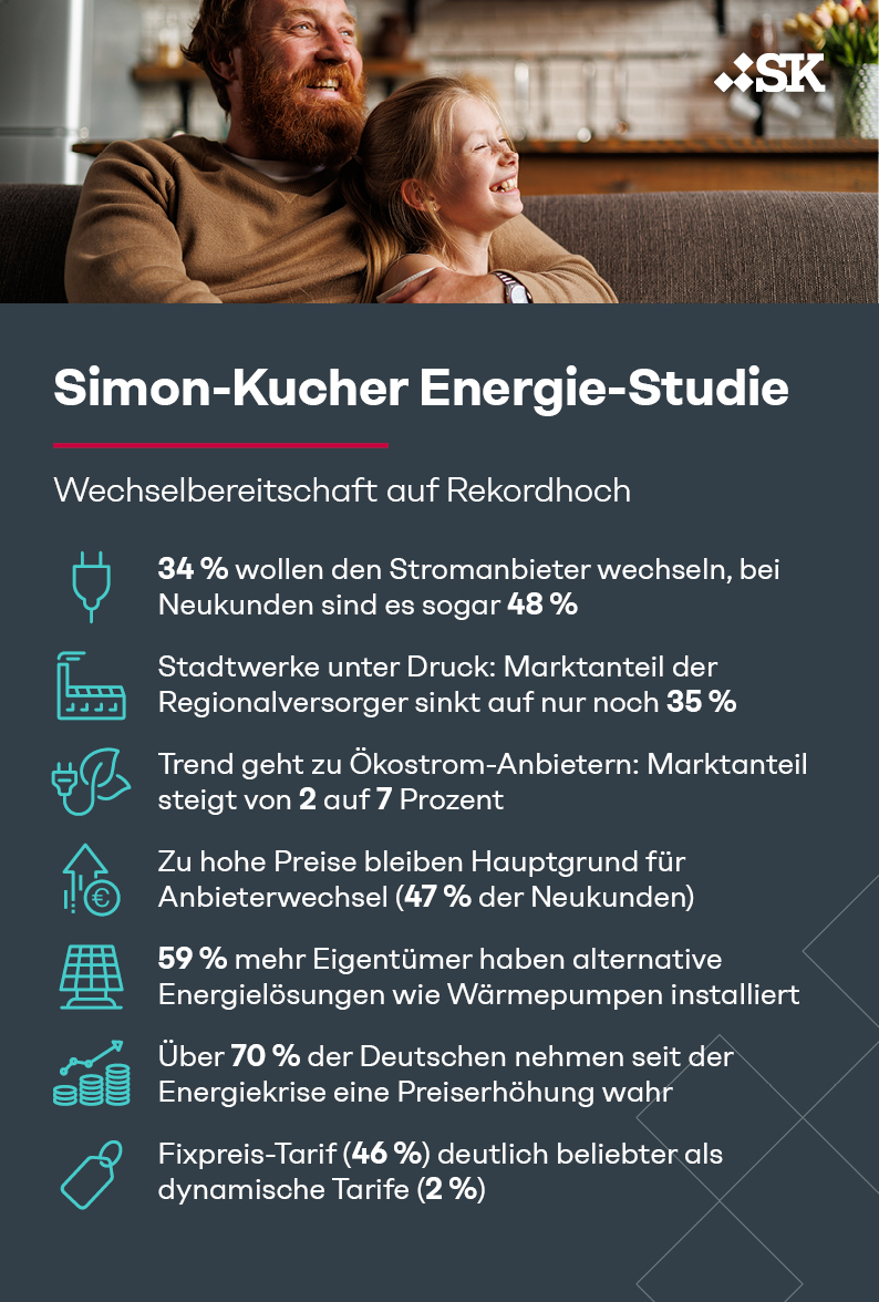 Kein Wunder - denn: "Über 70 Prozent der Deutschen nehmen seit der Energiekrise eine Preiserhöhung beim Strom wahr", weiß Malte Trukenmüller, Senior Director bei Simon-Kucher. "Der Preisschock bleibt auch nach der Energiekrise bestehen." Einer der Gründe, warum immer mehr Verbraucher die Grundversorgung verlassen. "Wir sehen gerade extrem viel Bewegung im Energiemarkt. Anbieter müssen jetzt gezielt in ihre Stärke investieren. Sonst könnten Marktanteile unwiderbringlich verloren gehen."