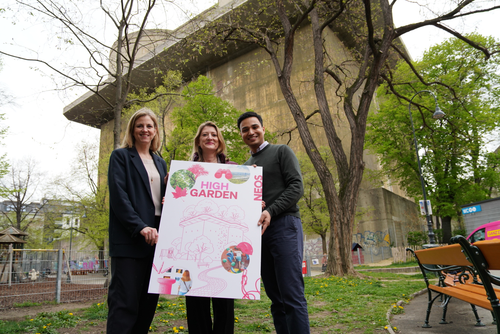Am Dienstag haben sich NEOS-Parteivorsitzende Beate Meinl-Reisinger, NEOS-Klubobmann Yannick Shetty und Wiens Vizebürgermeisterin Bettina Emmerling beim NEOS Village im Arenbergpark ein Bild von der Vision gemacht: „Der High Garden steht für genau das, was wir mit unserer Stadt vorhaben. Aufenthaltsqualität statt Betonwüsten, Kunst, Sport und Natur statt leerstehender Flächen. Und das im Bewusstsein unserer Geschichte. Dieser Bunker kann mehr sein als ein Mahnmal – er kann ein neues Wahrzeichen für den 3. Bezirk werden“, so die Vizebürgermeisterin.