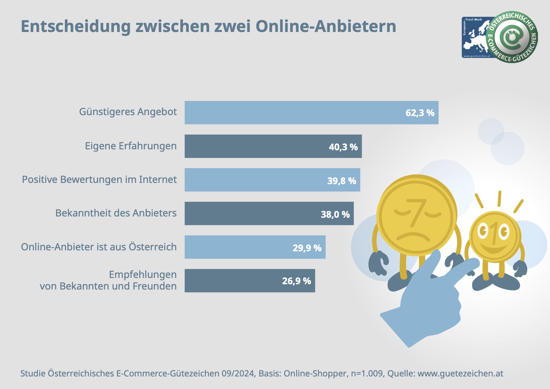Für 62 Prozent der Befragten ist nach wie vor der günstigere Preis das wichtigste Kriterium, wenn sie sich zwischen zwei Anbietern entscheiden sollen. Gleich an zweiter Stelle spielen für 40 Prozent die eigenen Erfahrungen eine große Rolle. Wer bereits einmal ein positives Shopping-Erlebnis hatte, kommt gern zu demselben Online-Anbieter zurück. Auch ob es sich um einen österreichischen Onlineshop handelt oder nicht, ist für 30 Prozent der befragten Personen ein Entscheidungsgrund.