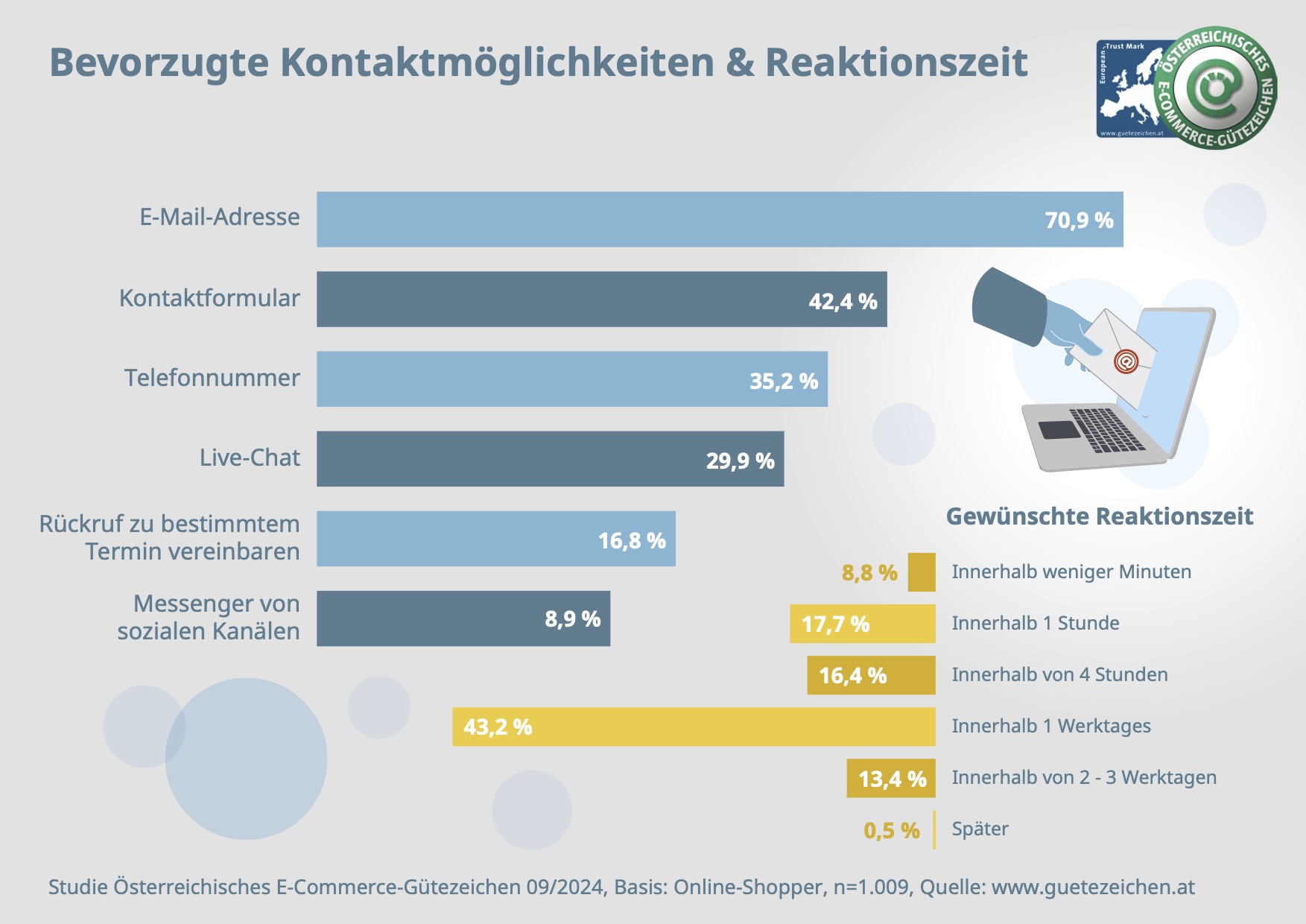 Die für die österreichischen Internetnutzerinnen und Internetnutzer repräsentative Studie des Österreichischen E-Commerce-Gütezeichens wurde von Marketagent.com im September 2024 mittels Online-Befragung unter 1.009 Österreicherinnen und Österreichern (zwischen 14 und 69 Jahren) durchgeführt.