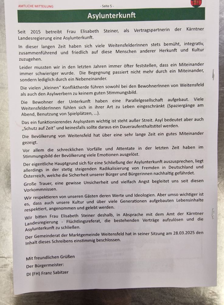 Der Bärenwirt gilt seit über einem Jahrzehnt als Vorzeigeprojekt gelungener Integration in Kärnten. Aktuell sind dort 22 Geflüchtete untergebracht – das entspricht nur rund 1,1 % der Bevölkerung der 1.998-Einwohner-Gemeinde. Der Gemeinderatsbrief enthält weder konkrete Vorfälle noch faktenbasierte Argumente für die geforderte Schließung – dafür umso mehr pauschale und rassistische Unterstellungen (siehe Brief).
