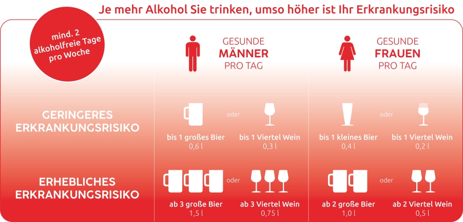 Das Risiko für körperliche und psychische Erkrankungen (darunter Krebs, Herz-Kreislauf-Erkrankungen und Depression) steigt mit der Menge und Häufigkeit des Alkoholkonsums.