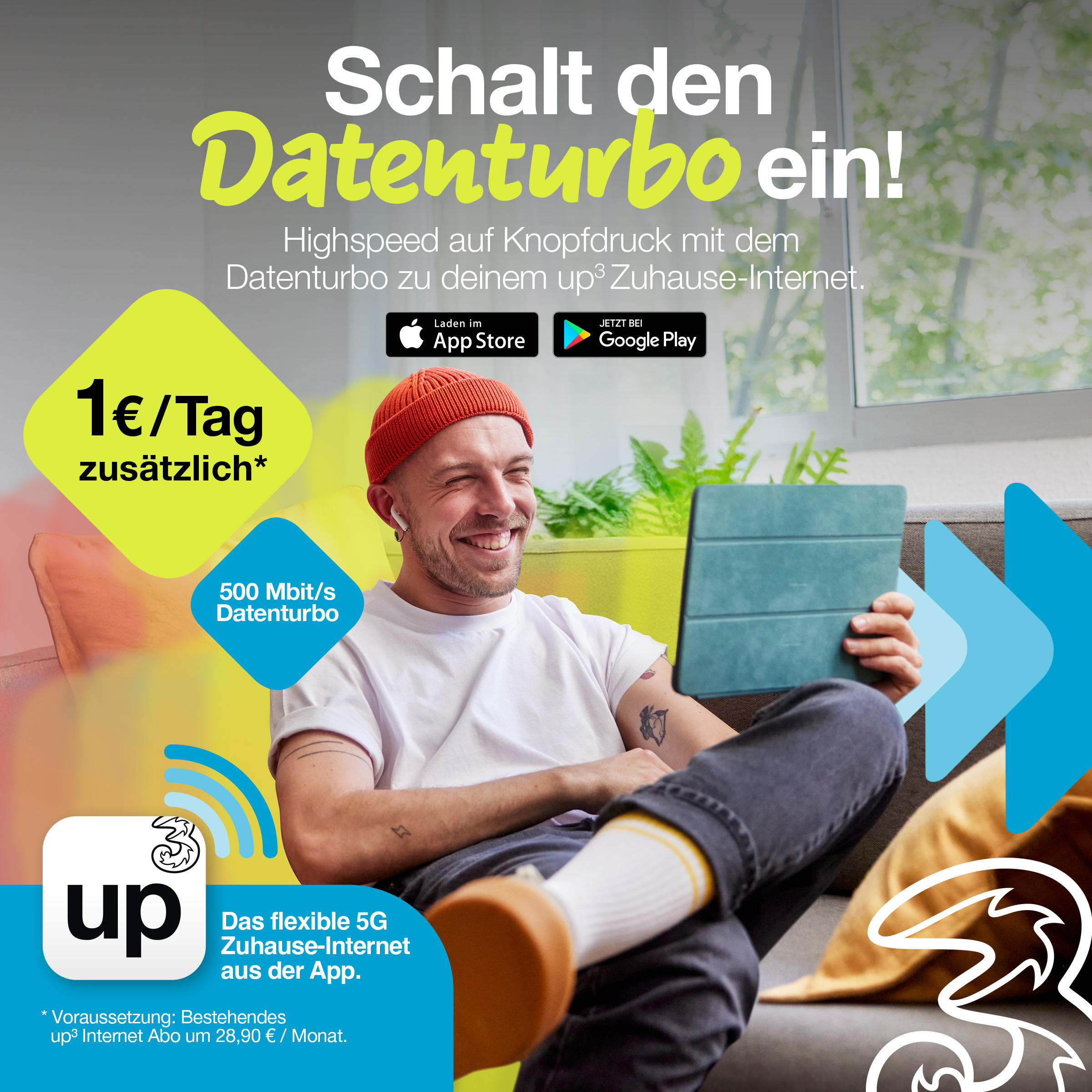 Einzigartig am Markt ist die Möglichkeit, mit dem Turbo-Booster die Internetgeschwindigkeit kurzfristig auf bis zu 500 Mbit/s anzuheben. Diese Lösung ist ideal für Gaming-Wochenenden, 4K Sportübertragungen oder ein wichtiges Zoom-Meeting, kostet nur 1 Euro/ Tag und ist – wie alles bei up³ - einfach über die up³ App aktivierbar.