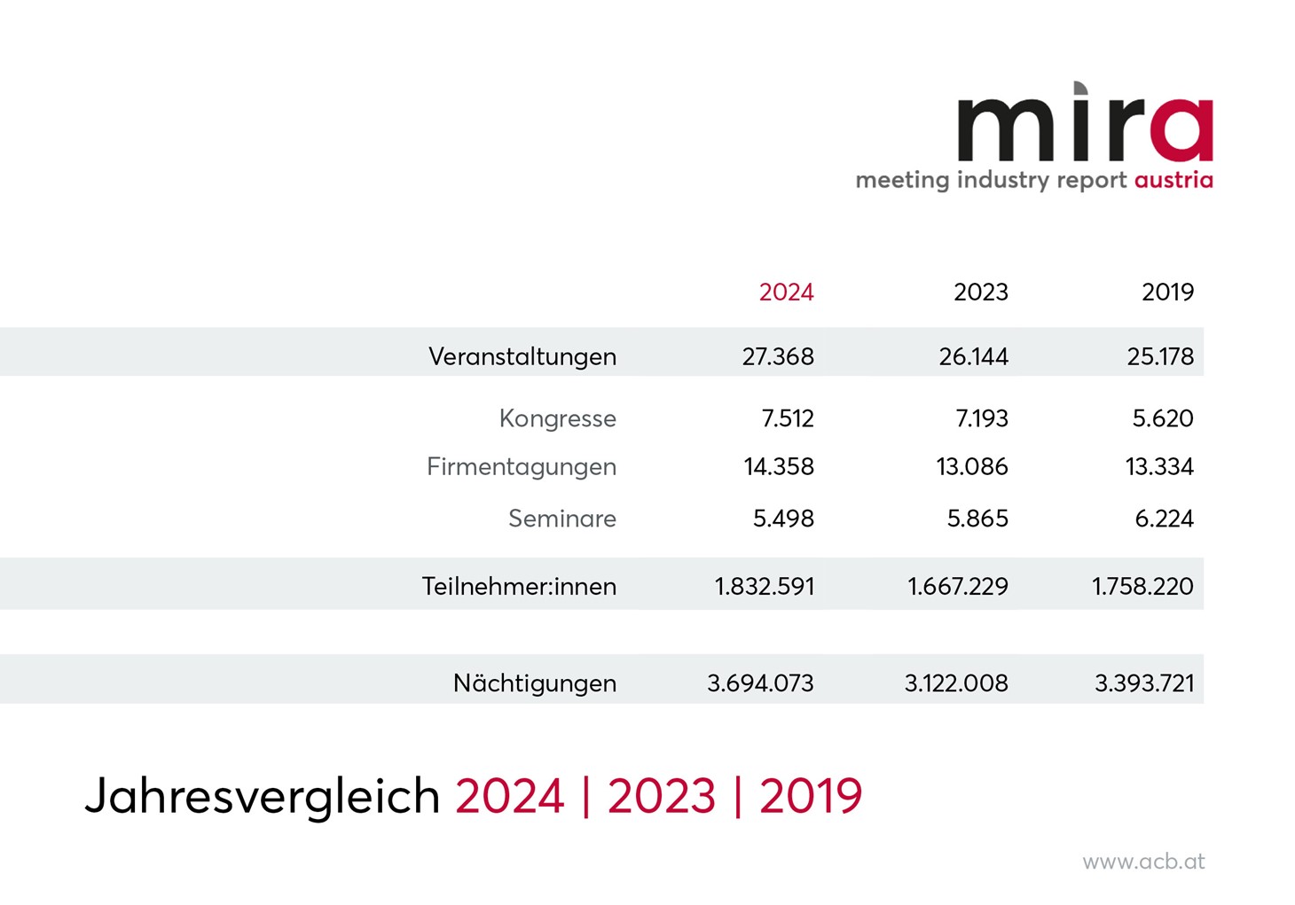 Seit Beginn der Aufzeichnungen legt der Meeting Industry Report Austria (mira) die Stärke und Relevanz dieses wichtigen Wirtschaftssegments dar, indem wertvolle Zahlen für die österreichische Tagungsbranche dokumentiert werden: Mit über 27.000 Veranstaltungen und rund 1,83 Millionen Teilnehmer:innen wurde 2024 erstmals das Vorkrisenniveau aus dem Jahr 2019 übertroffen.
