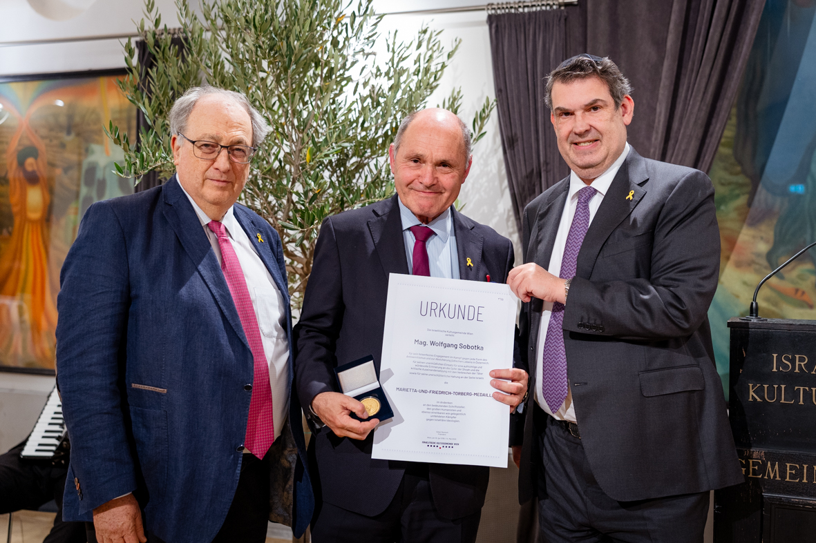Am Mittwochabend verlieh die Israelitische Kultusgemeinde Wien (IKG) auf einstimmigen Beschluss des Kultusvorstands die Marietta und Friedrich Torberg-Medaille an den ehemaligen Nationalratspräsidenten Wolfgang Sobotka. Diese wurde von IKG-Präsident Oskar Deutsch im Rahmen einer feierlichen Zeremonie im Gemeindezentrum der Kultusgemeinde überreicht.
