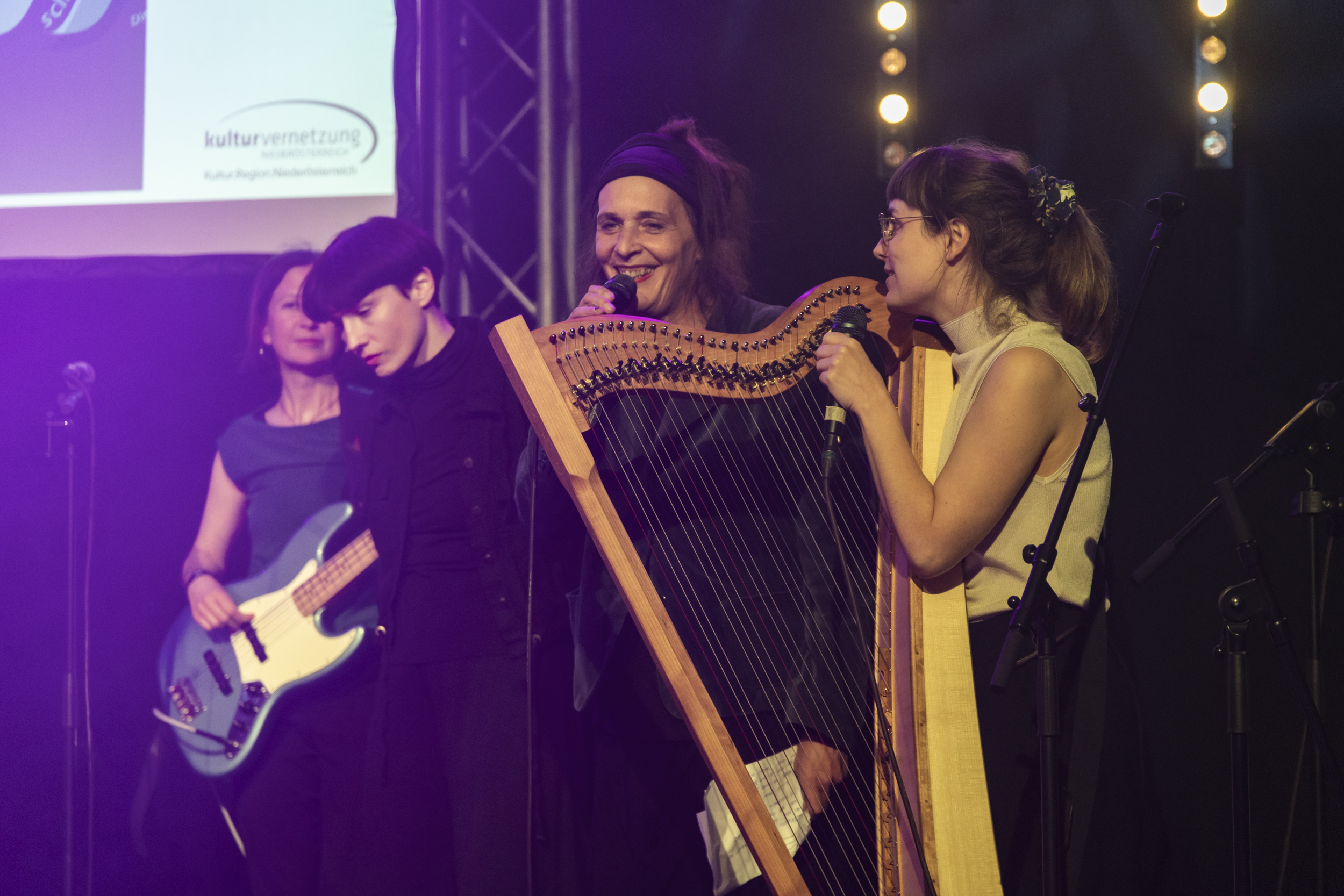 Sigrid Horn hat auch den ersten Programmpunkt des Festivals, ein gemeinsames Konzert Mostviertler Singer Songwriter eröffnet. Als würde man einen kleinen Stein auf eine glatte Wasseroberfläche werfen, begann sie den Konzertabend zunächst solo und dann gemeinsam mit SarahBernhardt mit ganz leisen Tönen. Doch die neue Mostviertler Welle wurde im Laufe des Abends mit Auftritten von Lou Asril, Dritte Hand, Tini Trampler, Gravögl und LITHA immer lauter und gipfelte in einem fulminanten Zusammenspiel der an diesem Abend auftretenden Künstlerinnen und Künstler. Mit dabei war auch der aus Burkina Faso stammende und in Niederösterreich lebende Musiker Djakali Kone, der am 18.5. in der Ahrenberger Kellergasse im Rahmen des Festivals mit den Hoizign Wurzlbuam auftritt, und bei der Eröffnung mit Raoul Gorka zu hören war. Das Konzert war damit der perfekte Einstieg in das Festival, bei dem die Vielfalt und Buntheit niederösterreichischer Regionalkultur gefeiert wird. Beeindruckt vom Eröffnungskonzert zeigten sich auch die vielen Ehrengäste, allen voran die Botschafterin aus Burkina Faso und Vorsitzende der Vereinigung der afrikanischen Botschafterinnen und Botschafter Excellence Madame Maïmounata Ouattara, der Geschäftsführer der Kultur.Region.Niederösterreich Martin Lammerhuber, sowie die Abgeordneten zum niederösterreichischen Landtag Bernhard Ebner, Dominic Hörlezeder und Helga Krismer-Huber, Botschafterin Regina Rusz, der Musiker Mamadou Diabate, und zahlreiche Bürgermeisterinnen und Bürgermeister sowie Gemeindevertreterinnen und -vertreter aus den rund 40 Festivalgemeinden. Stellvertretend für diese hob der Bürgermeister von Amstetten Christian Haberhauer bei der Begrüßung der Gäste die innovative Kraft des Viertelfestivals im Kulturbereich für die Städte und Gemeinden Niederösterreichs hervor.