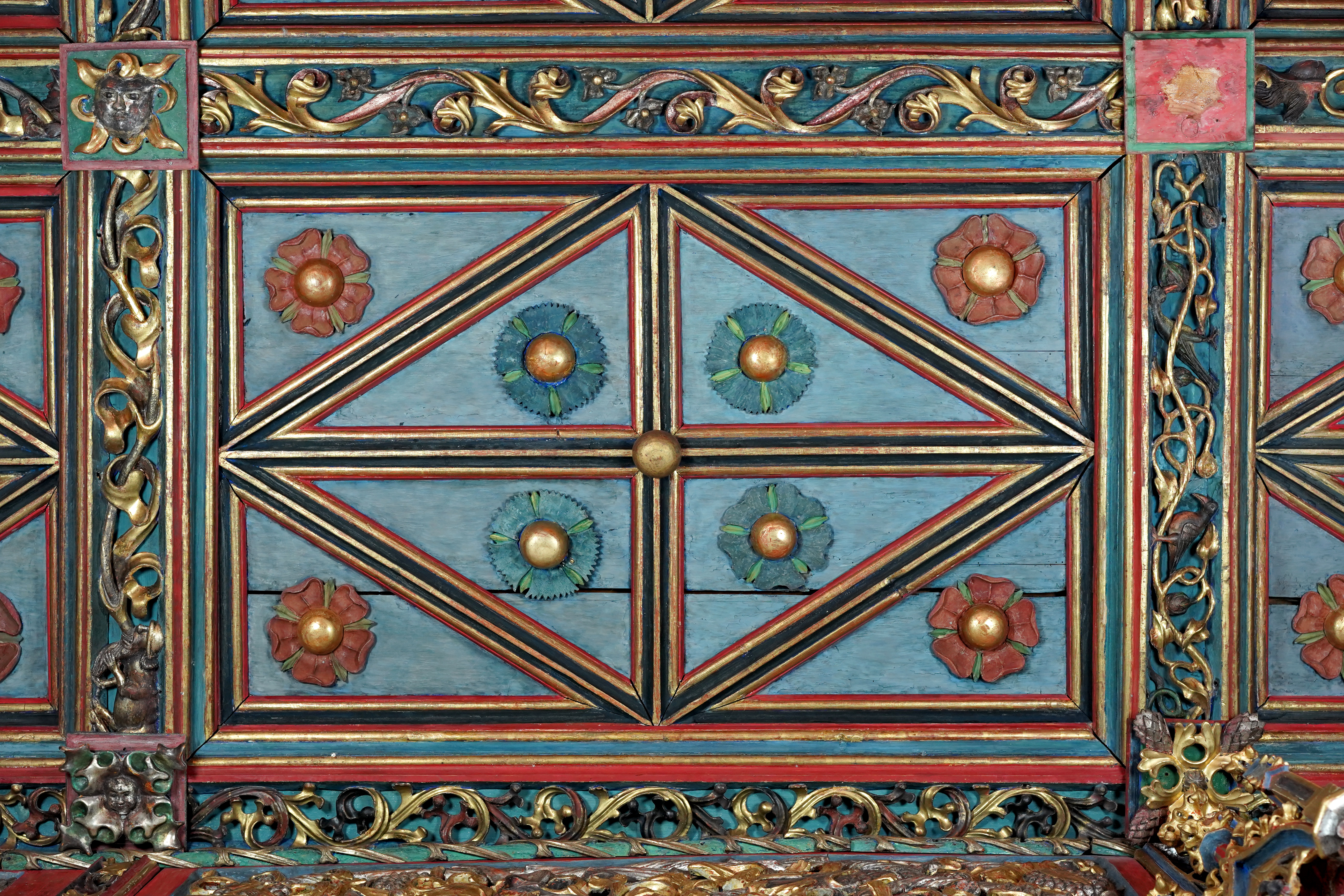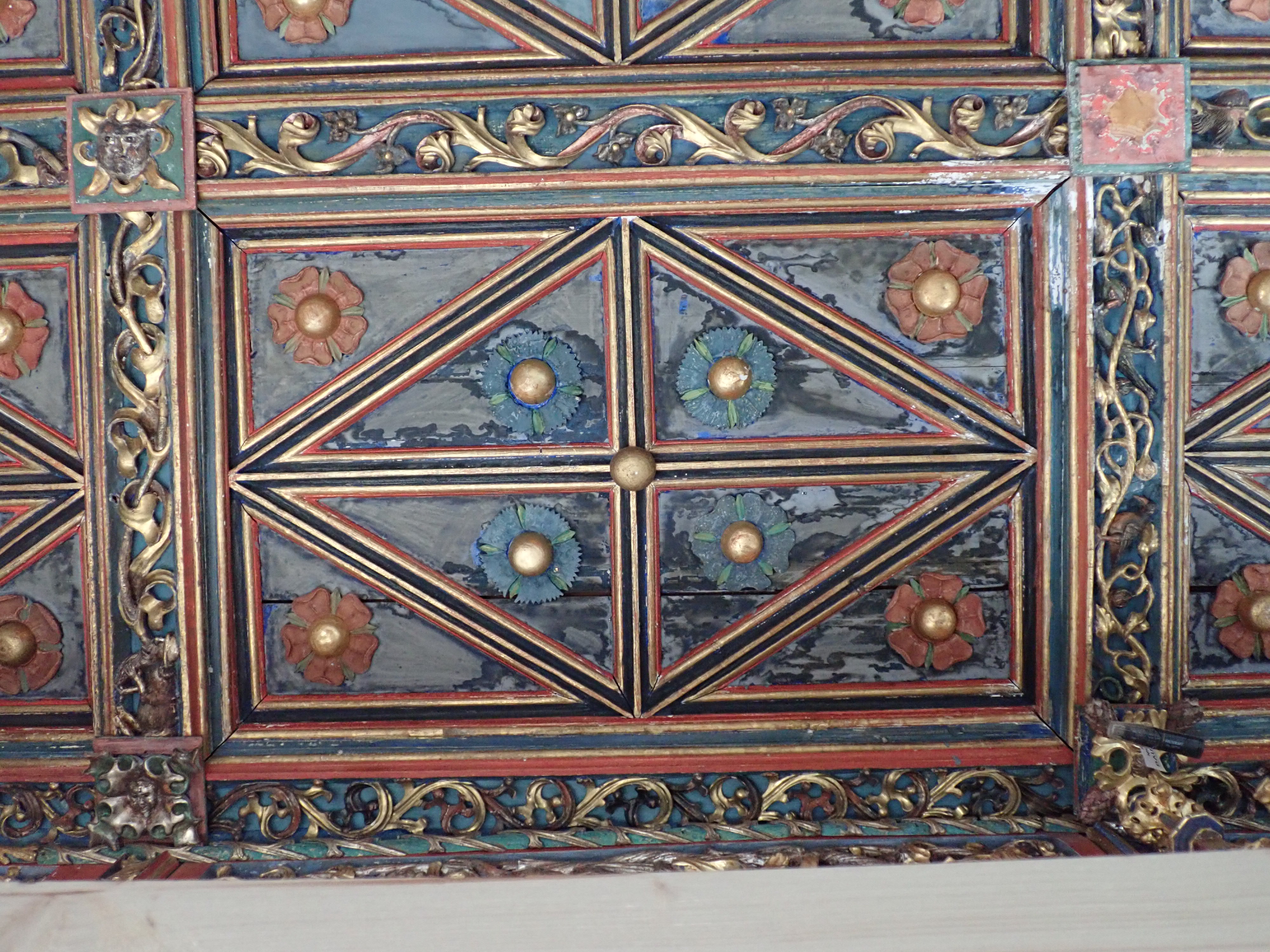 Schnitzwerke und andere Farbbereiche waren von zahlreichen Fassungsverlusten betroffen.