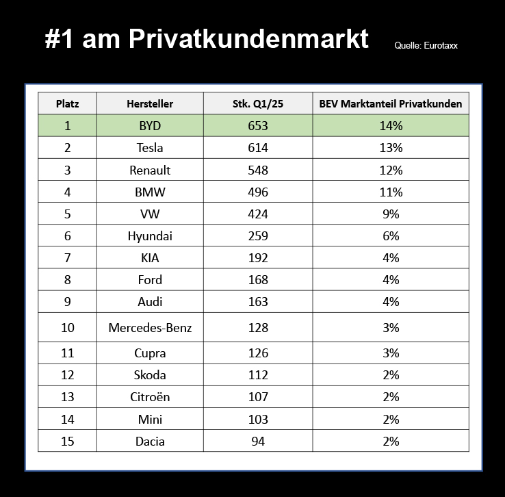 Laut Statistik Austria wurden von Jänner bis März 2025 exakt 1.427 BYD mit reinem E-Antrieb in Österreich neu zum Verkehr zugelassen. Davon entfielen laut Eurotax 653 Stück auf Privatpersonen, der Rest auf juristische Personen, Firmen und Gebietskörperschaften. Das macht BYD intern eine Verteilung von 46 zu 54 % zwischen privaten und gewerblichen Zulassungsbesitzern.