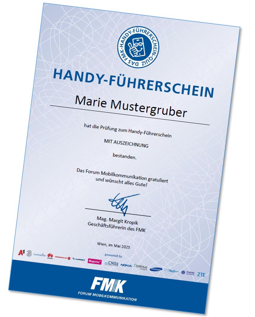 Anlässlich der Diskussion rund um das von Bildungsminister Wiederkehr seit Anfang des Monats eingeführte Handyverbot in Schulen hat das Forum Mobilkommunikation den Handyführerschein für Jugendliche ins Leben gerufen. Die Prüfung zum FMK-Handyführerschein basiert auf dem interaktiven Tablet-Kurs „Mobile Generation“, der bereits seit Herbst letzten Jahres gemeinsam mit umfangreichem Lehrmaterial für die 6. bis 8. Schulstufe zur Verfügung steht. Dieses Material ist – so wie auch der Handyführerschein selbst – kostenlos abrufbar.