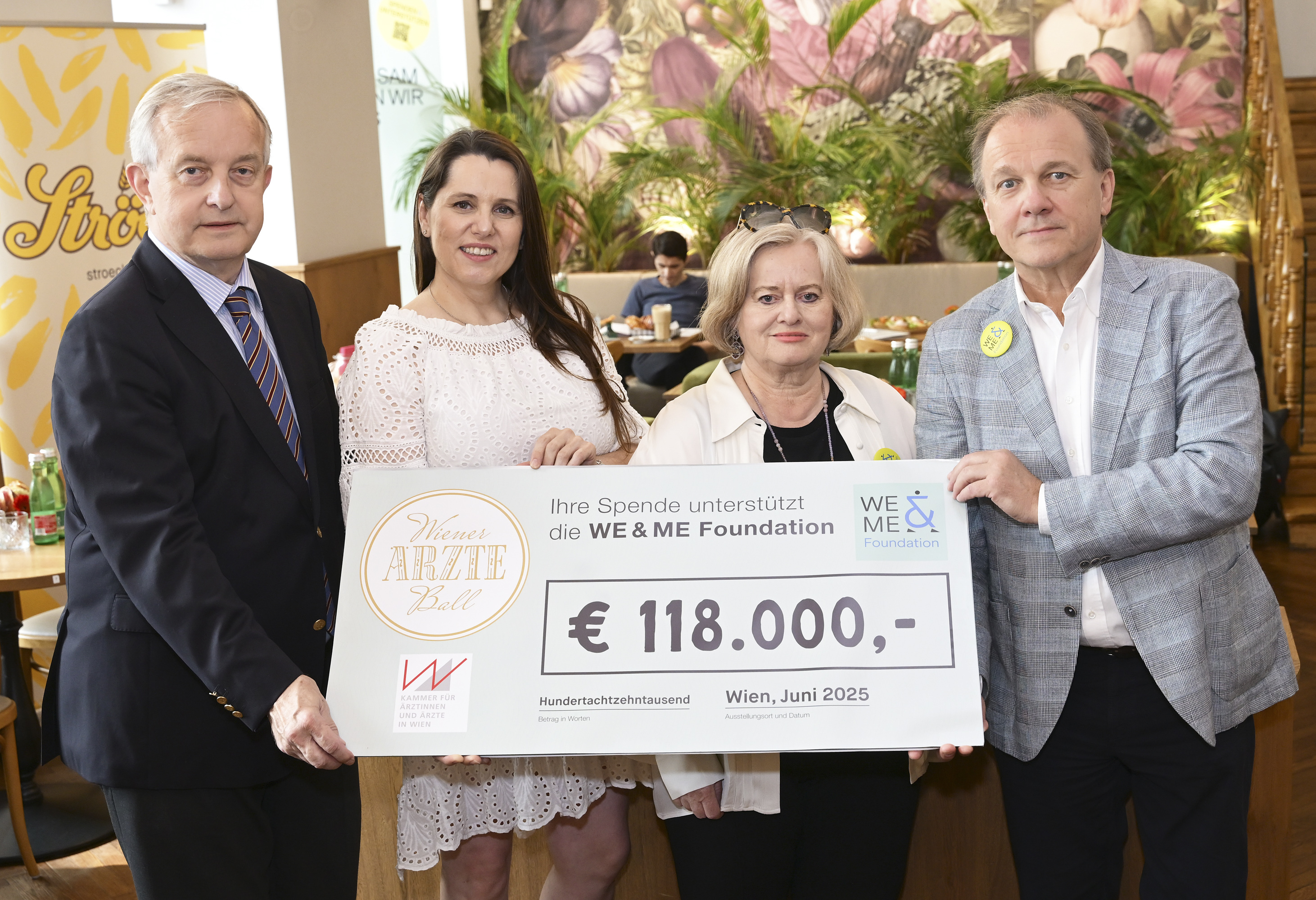 Im Rahmen eines Pressetermins im „Ströck-Feierabend“ wurde der offizielle Spendenscheck des 73. Wiener Ärzteballs von Johannes Steinhart, Präsident der Kammer für Ärztinnen und Ärzte in Wien, und der Referentin des Ärzteballs Isabella Clara Heissenberger-Mass an die WE&ME Foundation, vertreten durch die Gründer Gabriele und Gerhard Ströck, überreicht.