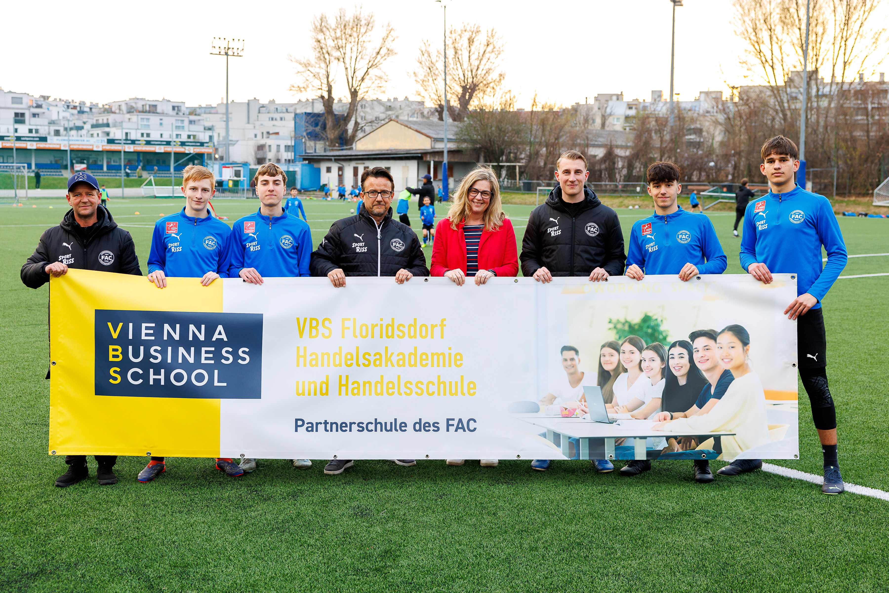 Die VBS Floridsdorf – Handelsakademie und Handelsschule – geht mit dem Floridsdorfer Athletiksport-Club (FAC) eine Bildungs-Partnerschaft ein. Dazu trafen sich Vertreterinnen und Vertreter von Schule und Fußballklub am FAC-Sportplatz zur Übergabe der VBS-Bandenwerbung. Die dient nun als sichtbares Zeichen der neuen Zusammenarbeit. „Wir freuen uns, dass der FAC bei seiner ständigen Professionalisierung der Ausbildung, die VBS Floridsdorf zur Zusammenarbeit eingeladen hat“, sagt Helmut Schramm, Vorstand des Fonds der Wiener Kaufmannschaft, der der private Betreiber der VBS Floridsdorf ist.