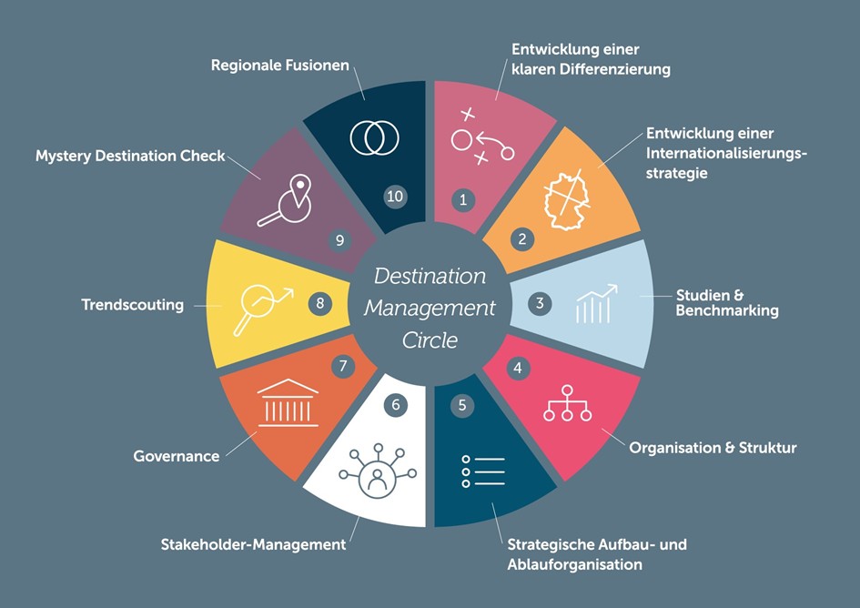 Der Destination-Management Circle umfasst zehn ineinandergreifende Handlungsfelder, die Regionen als Grundlage für Analyse, Strategieentwicklung und Umsetzungsbegleitung dienen. Ziel ist es, die vorhandenen Potenziale ganzheitlich zu nutzen. Zu den Beratungsschwerpunkten von Prodinger zählen: