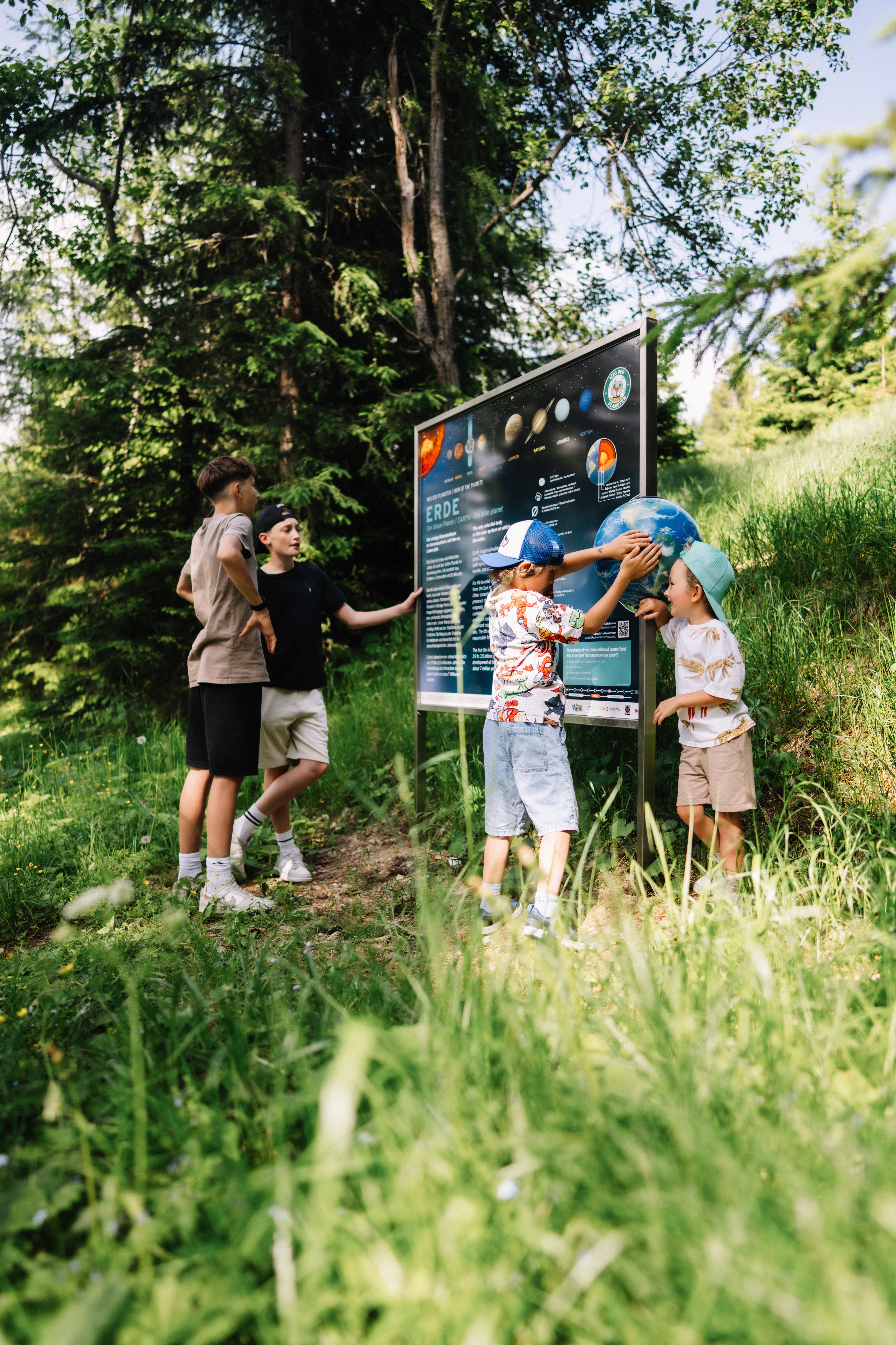 Elf großformatige Tafeln – eingebettet in die eindrucksvolle Bergwelt – vermitteln Fakten über das Sonnensystem, die acht Planeten, den Asteroidengürtel und unseren Zentralstern, die Sonne. Ergänzt wird das analoge Erlebnis durch interaktive Elemente wie ein drehbares Planetenmodell, Quizfragen und – als Herzstück – zwei Augmented-Reality-Erlebnisse, die das Sonnensystem am Smartphone zum Leben erwecken.