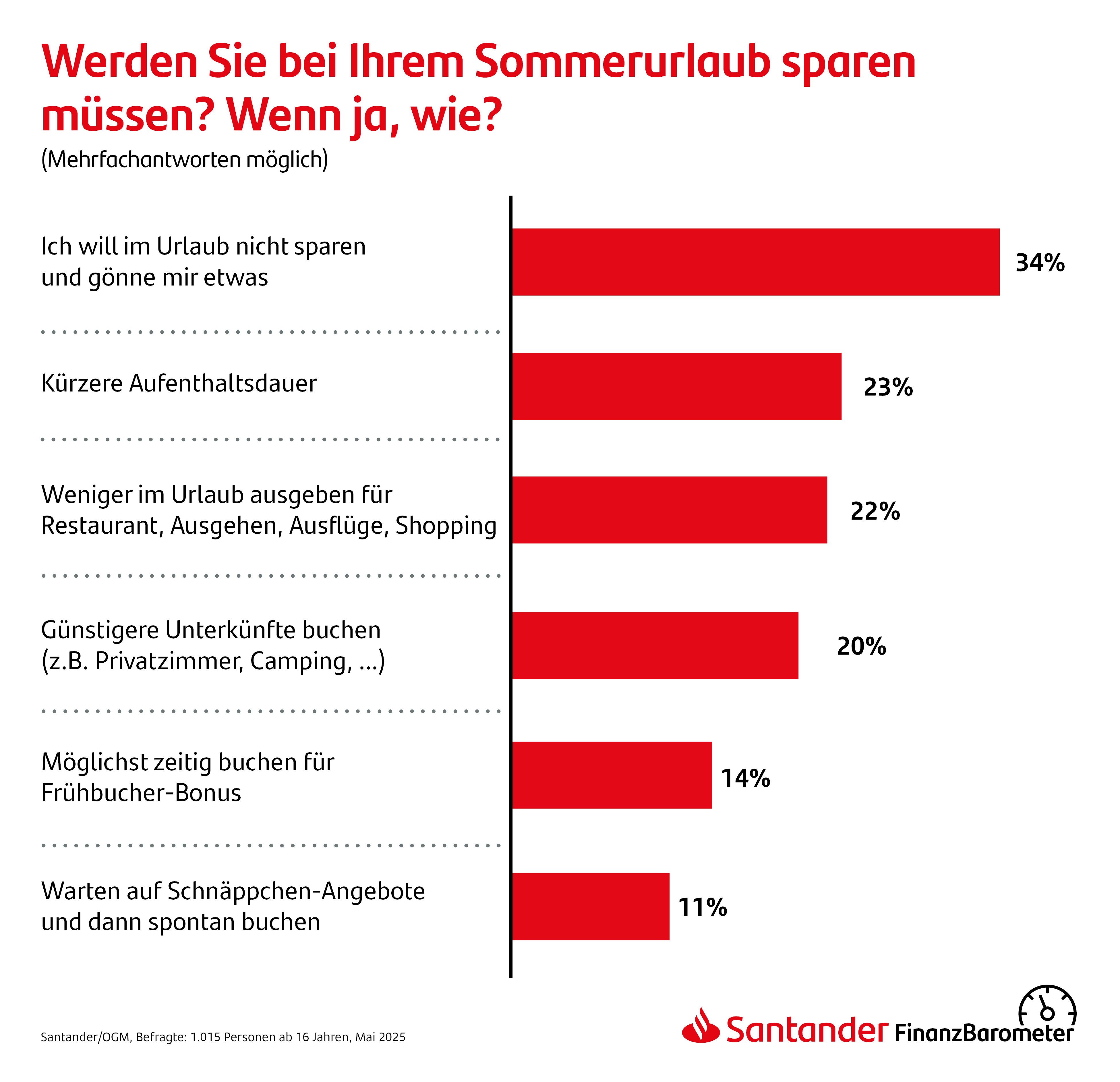 Trotz wirtschaftlicher Unsicherheit und der Teuerung, die auch in vielen Urlaubsländern zu spüren ist, wollen sich viele Österreicherinnen und Österreicher den Sommerurlaub nicht nehmen lassen – und sich dabei bewusst „etwas gönnen“. Knapp zwei Drittel der Bevölkerung ab 16 Jahren plant zu verreisen. Immerhin ein Drittel davon gibt im aktuellen Santander-Finanzbarometer an, im Urlaub gar nicht sparen zu wollen.