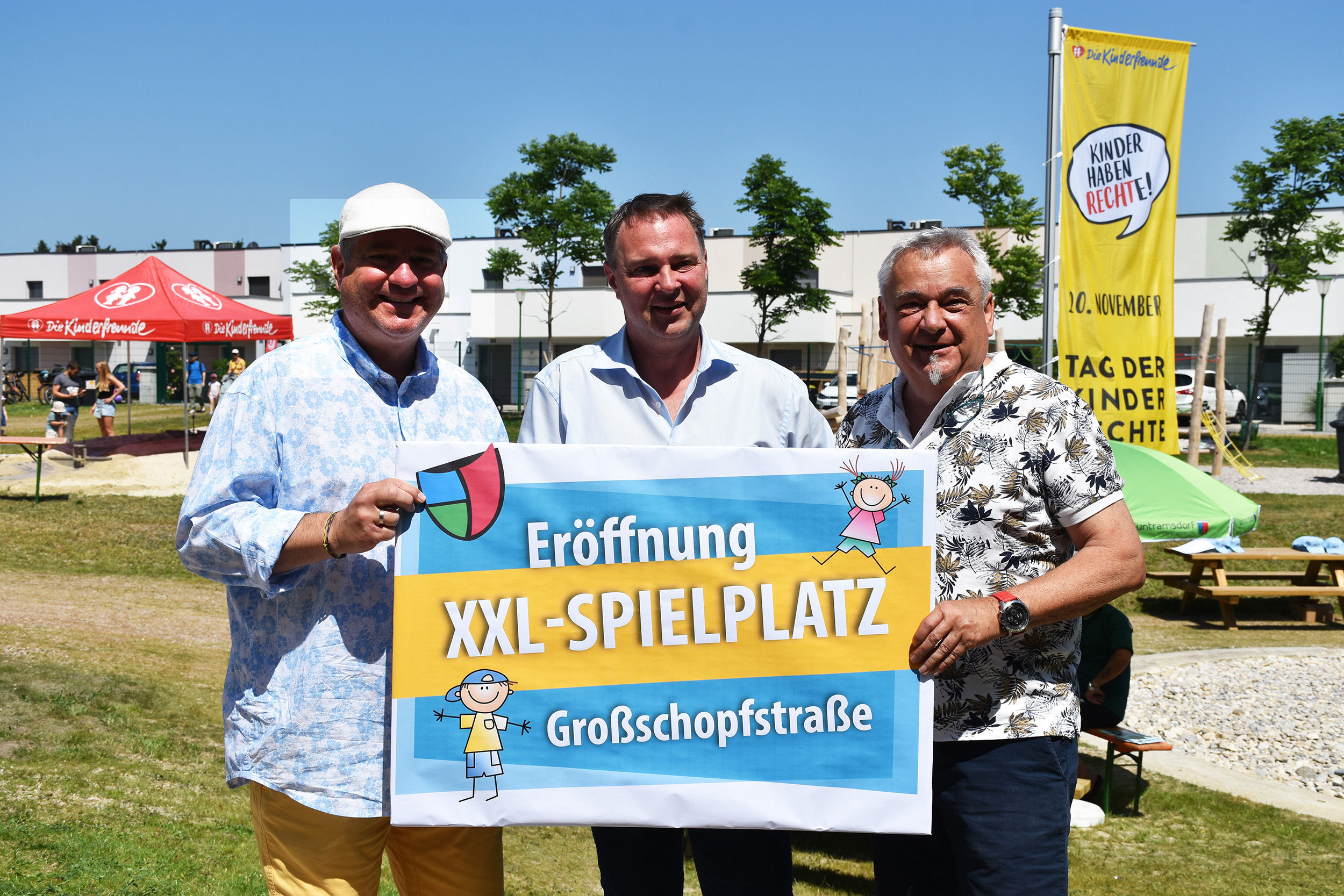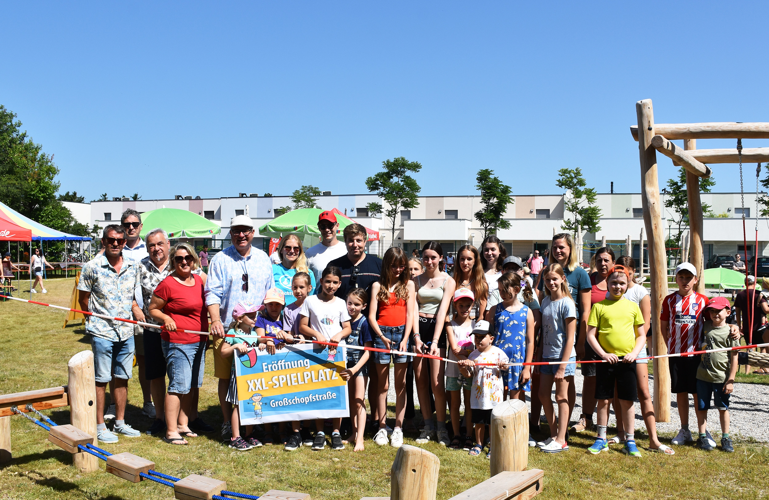 Höhepunkt der Guntramsdorfer Spielplatzoffensive: XXL-Spielplatz mit Riesenfest eröffnet. Beteiligung, Qualität und soziales Miteinander im Mittelpunkt des Projektes.
